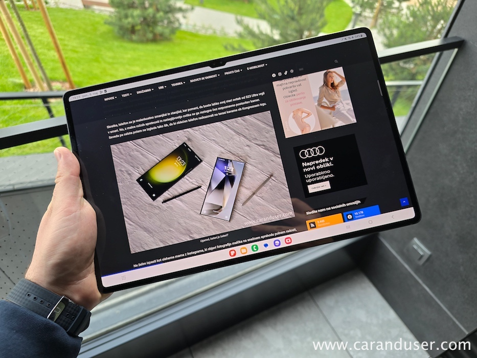 No, tablica ni samo prelomljen prenosni računalnik v prenesenem pomenu, ampak tudi dejansko. Z dodatno opremo tipkovnice (ki, aktivira funkcijo DeX) namreč S9 Ultra postane prav uporaben ”računalnik”. Ker ima zaslon 90-odstotno pokritost glede na dimenzije, praktično brez težav nadomesti moj 15,6-pačni zaslon prenosnega računalnika. Še ena zanimivost. Dimenzije tablice so posledično razširile tipkovnico, ki je zdaj bolj uporabna s širšimi razmaki ter večjo drsno ploščico – žal komplet ni bil prisoten na testu, ogledal sem si ga v butiku.