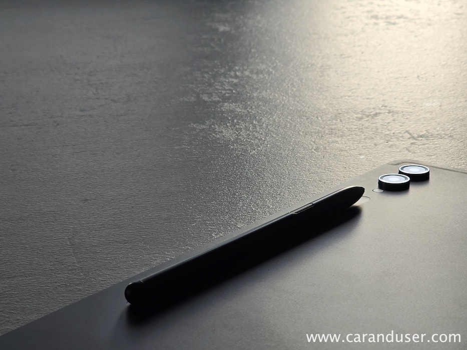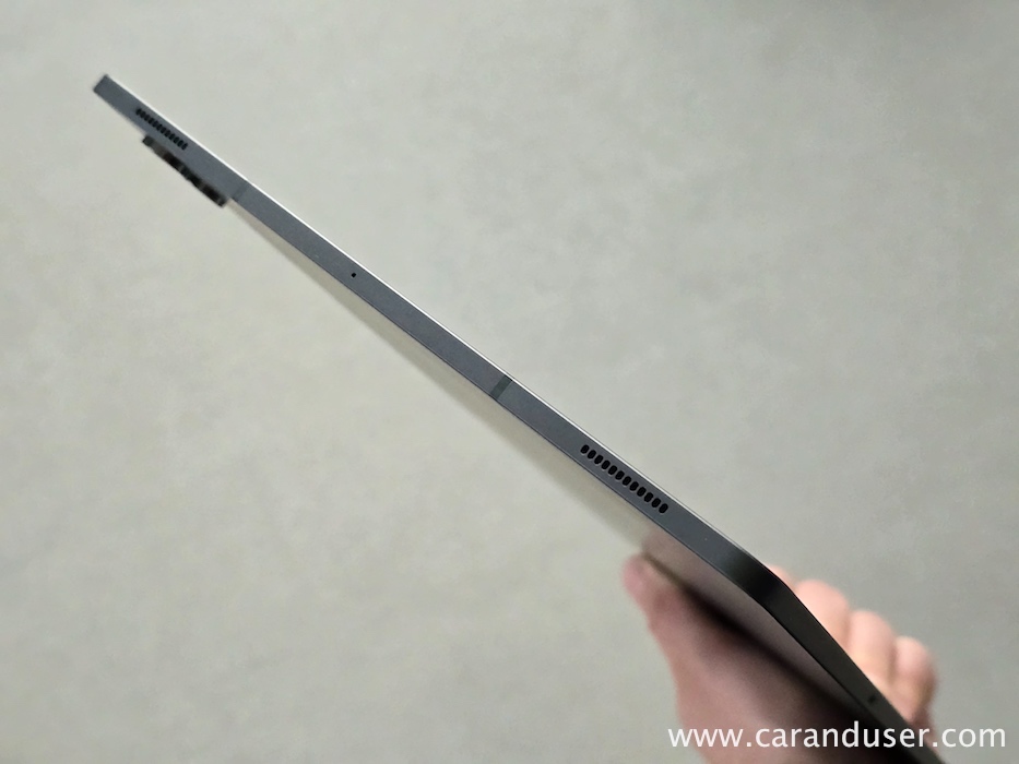 Izgled je dominanten. Z dimenzijami 326.4 x 208.6 x 5.5 mm deluje kot bi s prenosnega računalnika sneli zaslon. Na tem mestu sem dobil ”žarnica” moment, ki ga razjasnim kasneje. Zavoljo konkretnih dimenzij višine in širine se zdi, da se bo vitko telo vsak čas prepognilo in počilo. Vendar to je zgolj moja domišljija. Ohišje in zadnja stran sta narejena iz aluminija, ki zagotavlja trdnost in lahkotnost. 732 g ima naprava, ob tem pa nudi protiprašno ter vodotesno zaščito po standardu IP68. V grobem ni kaj dodati, mogoče opazko, da so skupno na krajših stranicah štirje zvočniki, zadaj se nahajata dve kameri, ki mimogrede proizvajata lepe fotografije, polnilno mesto za pisalo, medtem ko je spredaj 14,6-palčen zaslon nad katerim sta nameščeni dve kameri (prideta še kako prav za video konference, saj širokokotna sledi govoreči osebi in jo izpostavi).