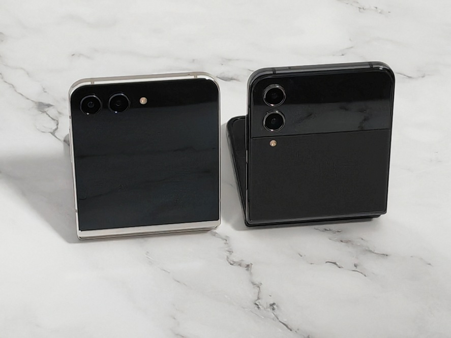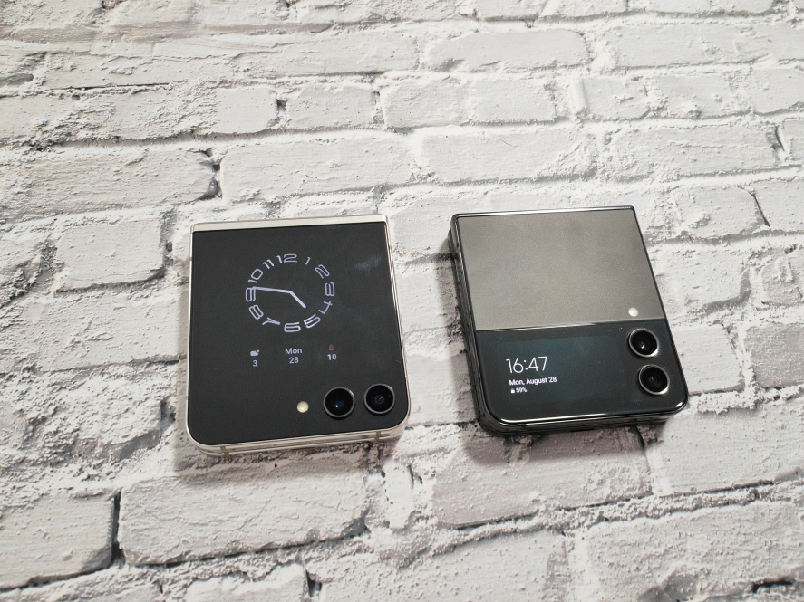 Zaslon je pri obeh Flipih enak, in sicer AMOLED 2x s frekvenco osveževanja 120 hercev, Flip5 se lahko pohvali zgolj s tem, da zmaga v svetilnosti (1750 nitov proti 1200). Je pa zato bistveno večja razlika v sprednjem zaslonu, ko sta Flipa zložena. Pri Flipu4 je le-ta odmerjen s skromnega 1,9 palca, medtem ko ima Flip5 sprednji zaslon velikosti 3,4 palca. V praksi to pomeni, da boste na Flipu4 lahko videli predvsem, kdo vas kliče, prebrali začetek sporočila (prikazuje tudi sporočila najrazličnejših družabnih omrežij), vremensko napoved, imeli shranjene tri najljubše osebe, katere boste lahko priklicali brez odpiranja zaslona … No, Flip5 je bistveno bolj radosten s prikazovanjem. Tam boste že lahko odgovarjali na sporočila, čeravno bo večino posegla po večjem zaslonu in se ne bo mučila z mukotrpnimi majhnimi tipkami. Na sprednjem zaslonu si lahko ogledate tudi posnetke z Youtuba, rokujete s koledarjem …