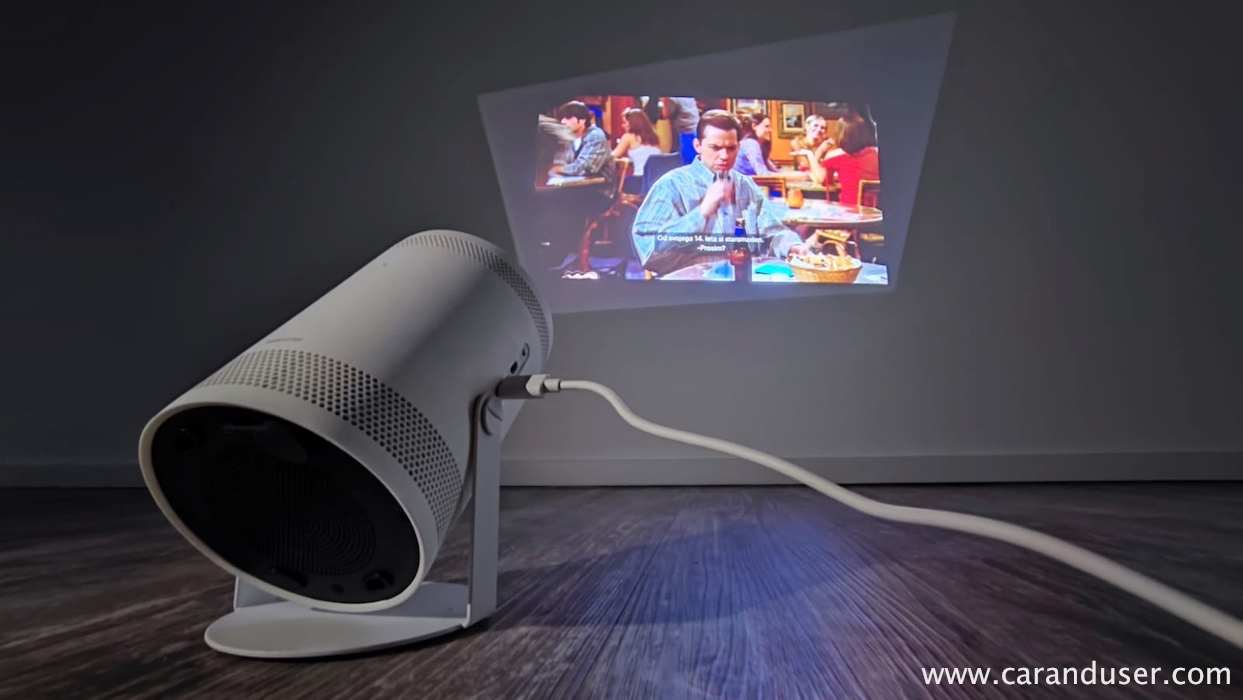 Na priloženem daljinskem upravljalniku, ki je bolj kot ne tudi edini način upravljanja s projektorjem, ni direktnega gumba za te nastavitve in se je do njih potrebno sprehoditi čez celoten meni. Ima pa direktne gumbe za Disney+, Netflix, Prime Video in Samsung TV Plus. Na daljincu je tudi gumb z mikrofonom za glasovno upravljanje, saj Freestyle omogoča uporabo Bixby in Amazon Alexe. Mikrofon na projektorju je možno tudi fizično izklopiti s stikalom na desni strani, ker se nahajata tudi Micro HDMI in USB-C vhod (slednji je le za napajanje). Kvaliteta slike na splošno je za tako majhen projektor resnično dobra, kar bi od Samsunga pri tej ceni tudi pričakovali – projektor ima namreč priporočeno ceno 999 evrov.
