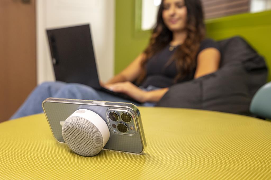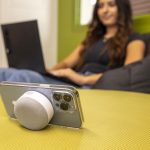 združljivim nosilcem za telefon. Magnetni nosilec za telefon varno drži telefon v pokončnem ali vodoravnem položaju, zaradi česar je idealen za gledanje ali ustvarjanje videoposnetkov, telefoniranje in fotografiranje.