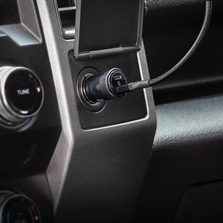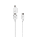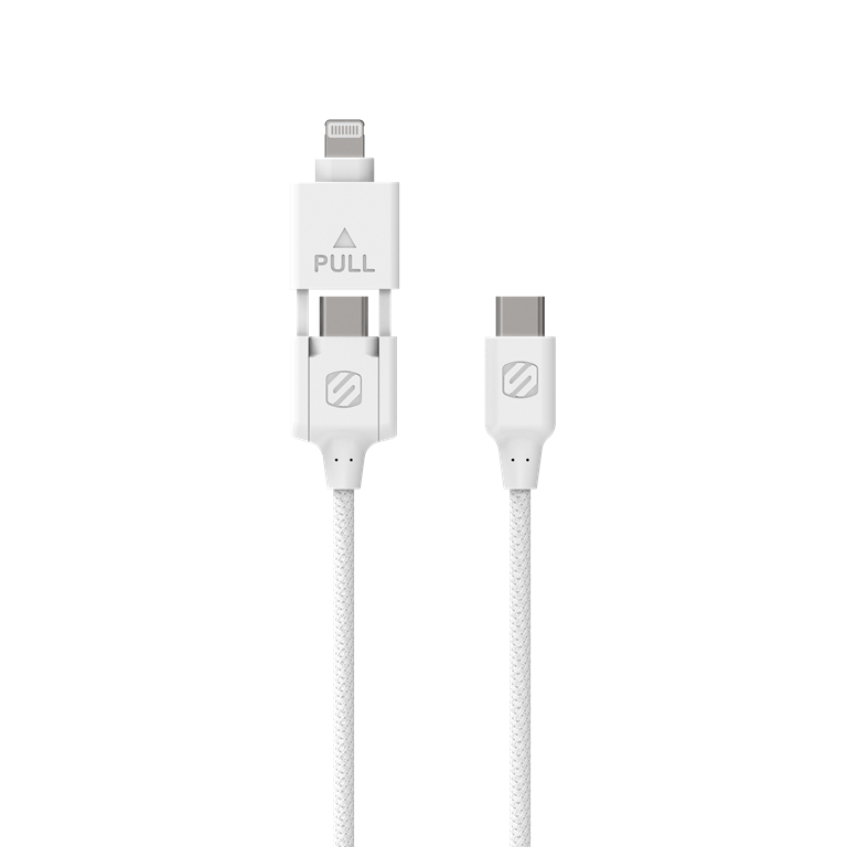 Kabel StrikeLine 2-v-1 uporablja poenostavljen drsni adapter vse-v-enem za menjavo iz USB-C na USB-C, na povezavo USB-C na Lightning s hitrim obračanjem glave.