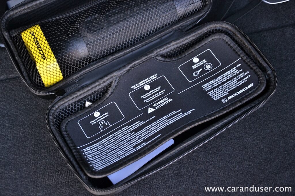 Preden preidemo na sam proces priprave na zagon vozila, poglejmo, kaj vse prejmemo v kompletu. V lični prenosni torbici z zadrgo se nahaja ‘svetilka’, adapter s ‘krokodiljimi klemami’ za vžig, polnilni kabel USB-A na USB-C, z možnostjo polnjenja preko 12 V v avtomobilu ter navodila za uporabo.