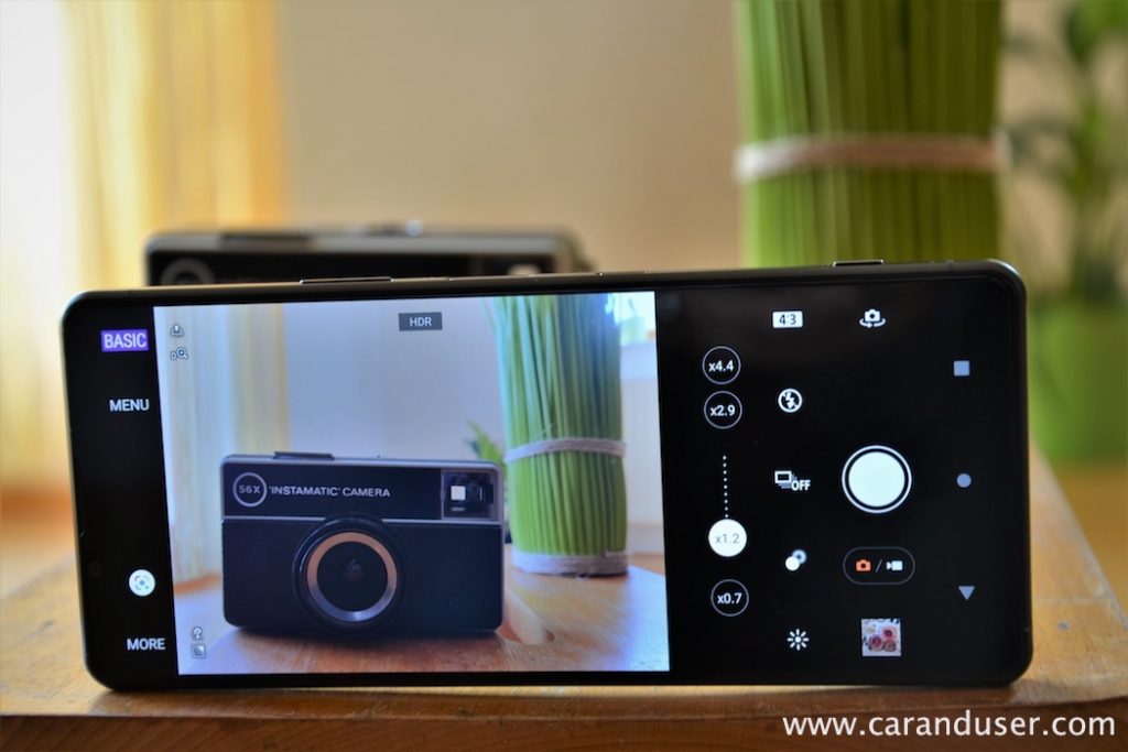 Ljubitelji fotografije boste s tem telefonom prišli na svoj račun. Kot sem že omenil v začetku prispevka, je to fotoaparat s funkcijami telefona. Ko zasučemo telefon okoli osi, v skrajnem levem kotu hrbtišča najdemo pravi foto arzenal. Na vrhu niza kamer je širokokotna kamera z 12 MP z zaslonko f/1,7 in 24 mm, ki deluje kot glavna kamera. Nižje se nahaja kamera z 12 MP ultra široko zaslonko f/2,2 16 mm, za primere, ko morate v okvir spraviti več ljudi ali več prizora. Povsem na dnu pa je skrit edinstven element Xperia 1 III, in sicer prilagodljiva telefoto kamera, ki obsega senzor 12 MP in dva objektiva – teleobjektiv f/2.3 70 mm in objektiv f/.2.8 105 mm. 70 mm poveča do 2,9x, medtem ko 105 mm objektiv ponuja 4,4x povečavo. Naprej povečavo zagotavlja 12,5x digitalni zoom.