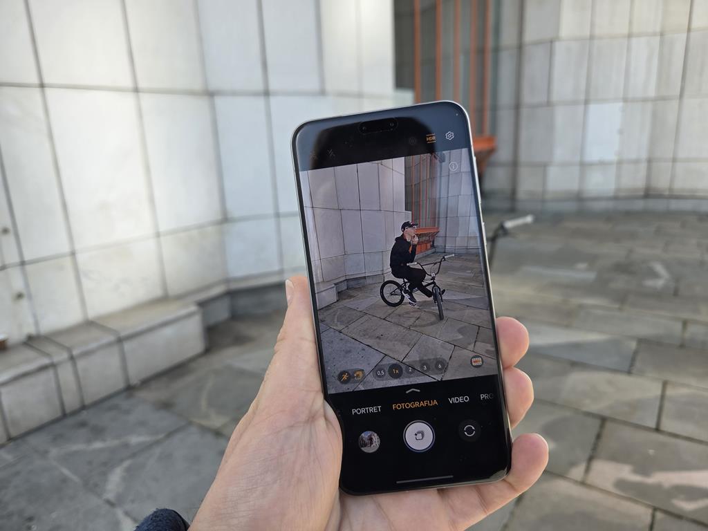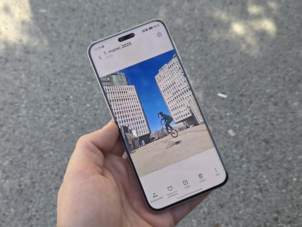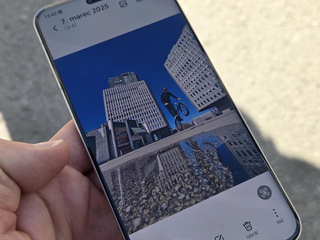 Za dinamične kompozicije je pripročna ultraširokokotna perspektiva, ki jo omogoča leča povečave 0.5x (fish-eye). Ta funkcija doda dramatičnost in globino športnim prizorom. Če želimo poudariti oddaljene objekte, je na voljo AI Super Zoom z 10x optično povečavo, ki zagotavlja neverjetno ostrino tudi pri oddaljenih subjektih, na primer pri fotografiranju profesionalnega kolesarja BMX v zraku z ozadjem gorskega obzorja, kar smo preizkusili na terenu.