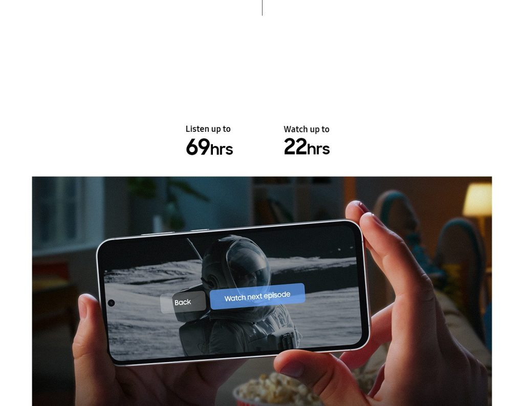 Slušalke Galaxy Buds FE presenetijo s svojo zmogljivostjo. Z enim polnjenjem baterije zagotavljajo do 30 ur neprekinjenega poslušanja, kar vam omogoča, da uživate v vašem dolgem seznamu glasbenih skladb, podcastov in video posnetkov z družbenih omrežij skozi ves dan. Tudi ob uporabi tehnologije ANC lahko uporabniki s slušalkami predvajajo do 6 ur, skupaj z ohišjem pa do 21 ur. Slušalke Galaxy Buds FE so po navdihu ikonične in ergonomske zasnove serije oblikovane tako, da so dovolj udobne za dolgotrajno nošenje in omogočajo bolj prilagojeno nošenje s tremi različnimi velikostmi ušesnih nastavkov in dvema različnima velikostima stranskih nastavkov.