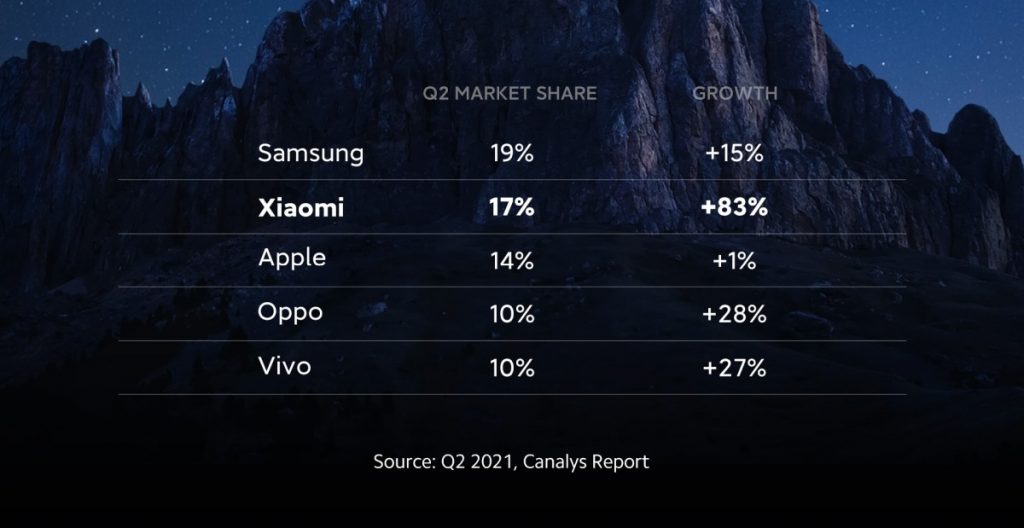 Znamka pametnih telefonov Xiaomi je po podatkih, vodilnega podjetja za analitike na svetovnem tehnološkem trgu Canalys, v drugem kvartalu 2021, zasedla 2. mesto po priljubljenosti pametnih telefonov med kupci po vsem svetu. Prvič v zgodovini se je Xiaomi zavihtel tik pod vrh lestvice najboljših, s 17 – odstotnim deležem in 83 – odstotno medletno rastjo ter s tem premagal tudi konkurenčni Apple.