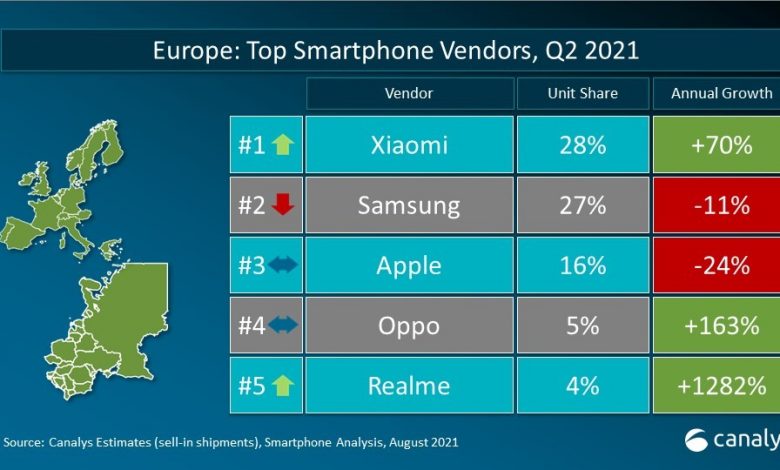 Po podatkih Canalysa o pošiljkah pametnih telefonov za letošnje drugo četrtletje, se je Xiaomi prvič zavihtel na prvo mesto v Evropi z 28-odstotnim tržnim deležem in 70-odstotno letno rastjo, kar dokazuje hitro rast podjetja ter močan zagon v Evropi.