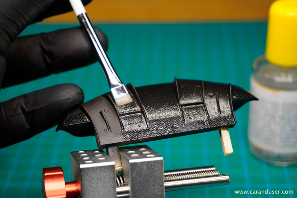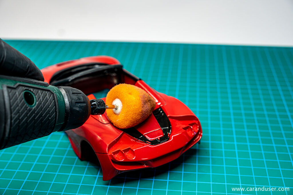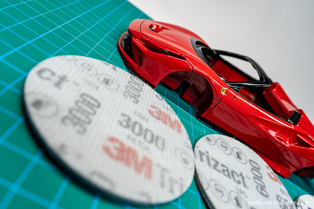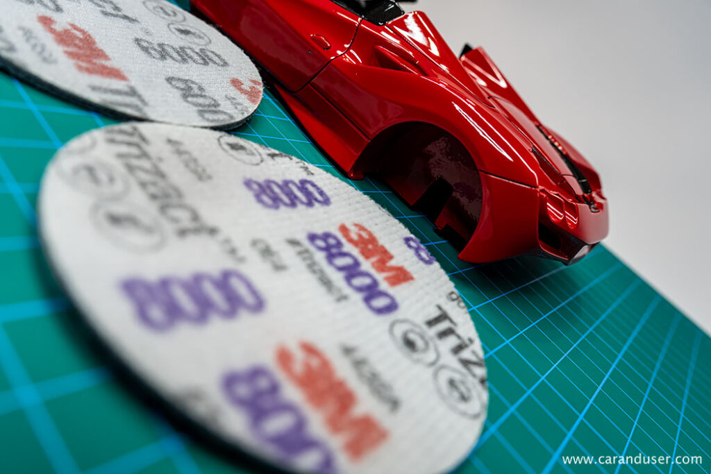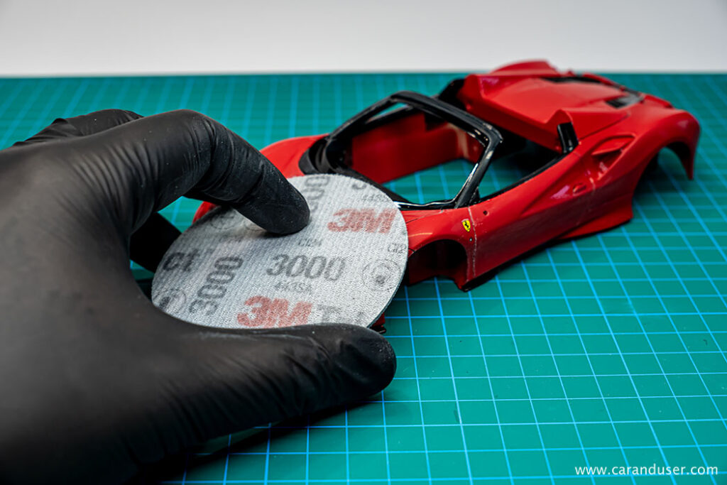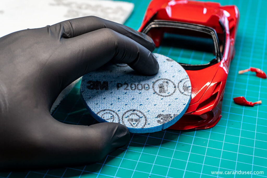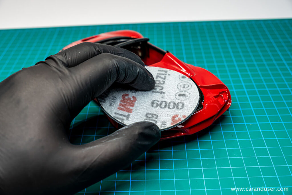 Po nekaj dneh nestrpnega čakanja, se lotimo nadaljnje obdelave. Tudi tokrat so maketi priložene nalepke za ponazoritev karbonskih delov vozila. Zato polakirano karoserijo najprej v celoti pobrusimo z uporabo brusilnih gobic in na težko dostopnih mestih tudi s tako imenovanimi Scotch Brite mrežicami.