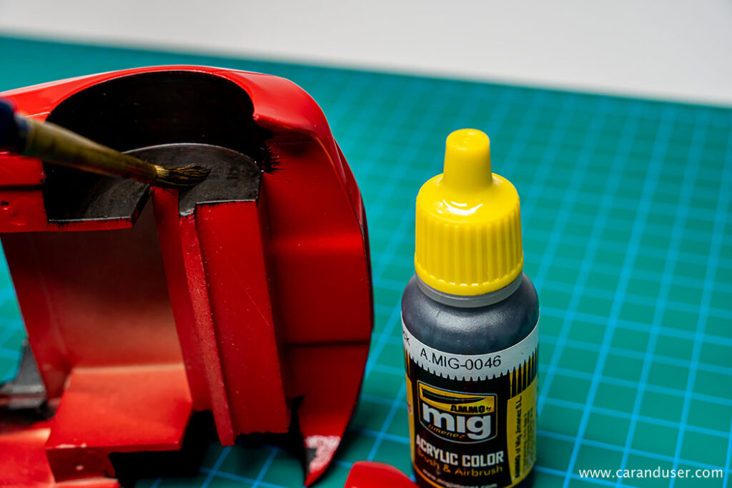 Za zaključek tokratnega prispevka še s pomočjo različnih čopičev in AMMO by Mig mat črne barve ročno pobarvamo koloteke in notranjost vetrobranskega loka.