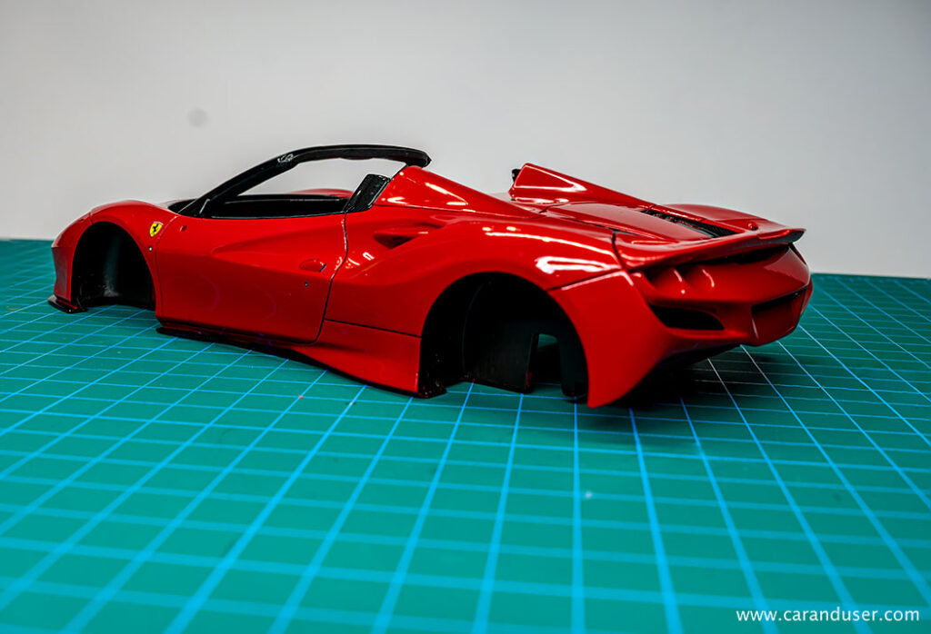 Tako tokrat začnemo kar takoj z barvanjem. Da zagotovimo kar se da enakomerno podlago najprej na karoserijo nanesemo primer, ker smo se odločili, da F8 Spider odenemo v Rosso Corsa rdečo barvo, so nam pri podjetju Spekter Žalec, kjer so nam tudi tokrat pripravili barvo na vodni osnovi po originalni recepturi, svetovali da za doseganje pravilnega odtenka svetovali uporabo bele podlage. S pomočjo airbrusha nanesemo primer bele barve podjetja AMMO by Mig. Po sušenju primerja nadaljujemo z nanosom barve, nanašamo jo v tankih slojih in med sloji počakamo nekaj minut, ko dosežemo želen odtenek barvo zaščitimo z dvokomponentnim avtomobilskim svetlečim lakom. Karoserijo pripravljeno na nadaljnjo uporabo pustimo nekaj dni, da se lak povsem strdi.