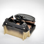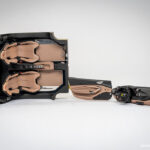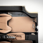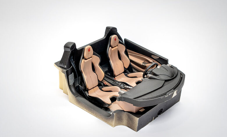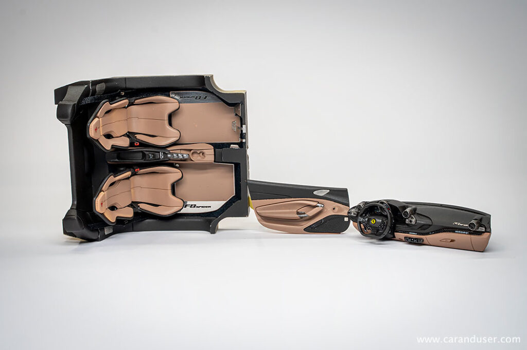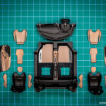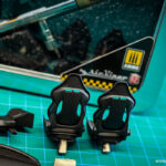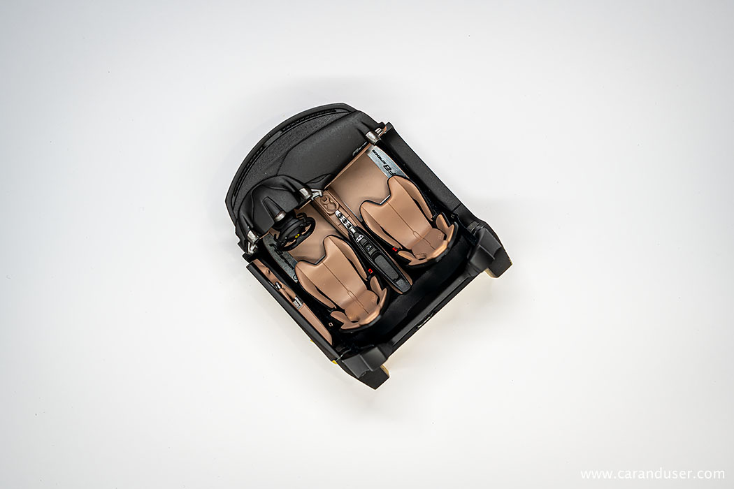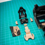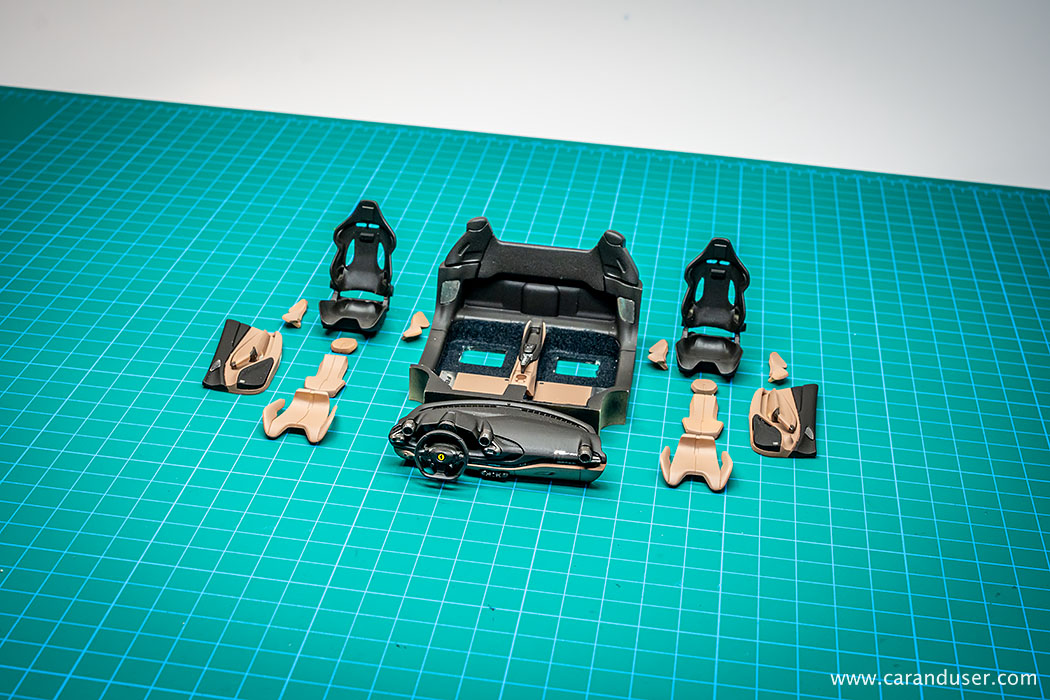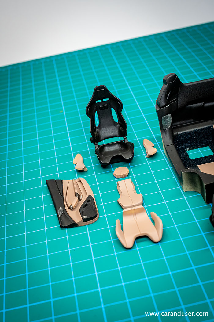 Ko so vse nalepke nameščene in vsi detajli izdelani, sledi končna montaža notranjosti. To začnemo s sestavljanjem sedežev, natančneje z nameščanjem usnjenih oblog na karbonske školjke sedežev. Za konec sedeža namestimo v notranjost in zgolj za potrebe fotografiranja namestimo prej omenjene že sestavljene sklope v celoto.