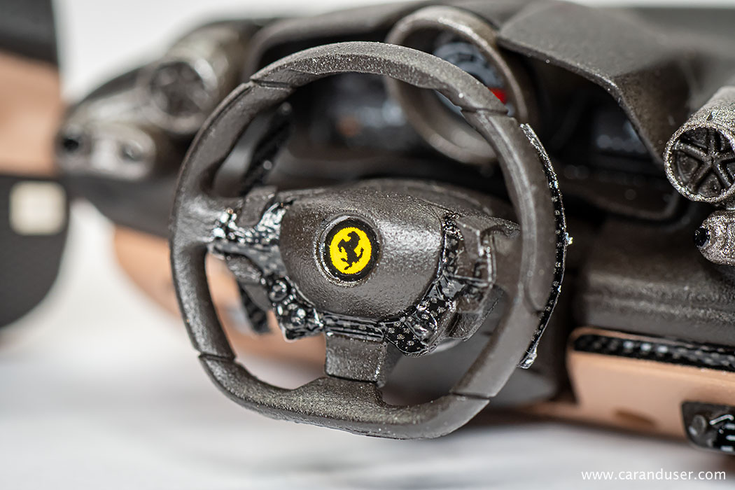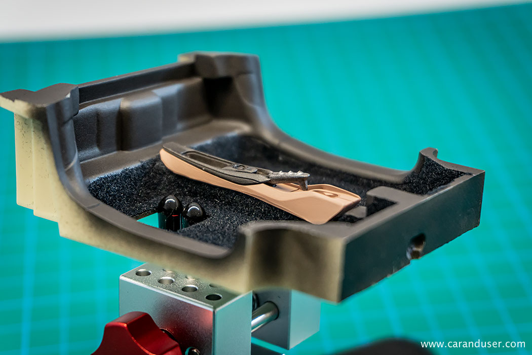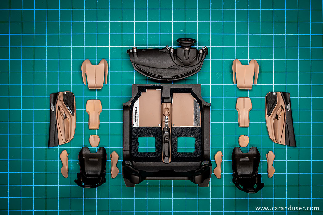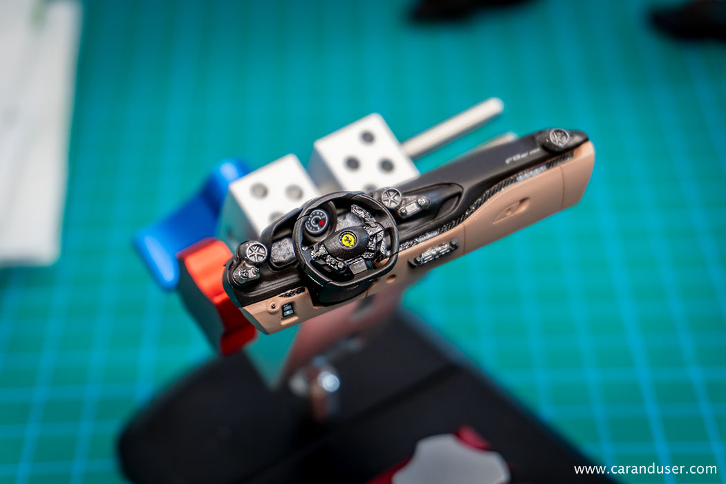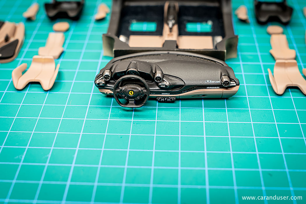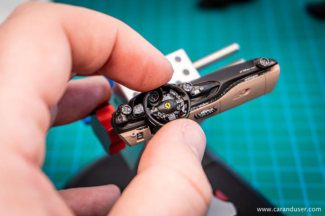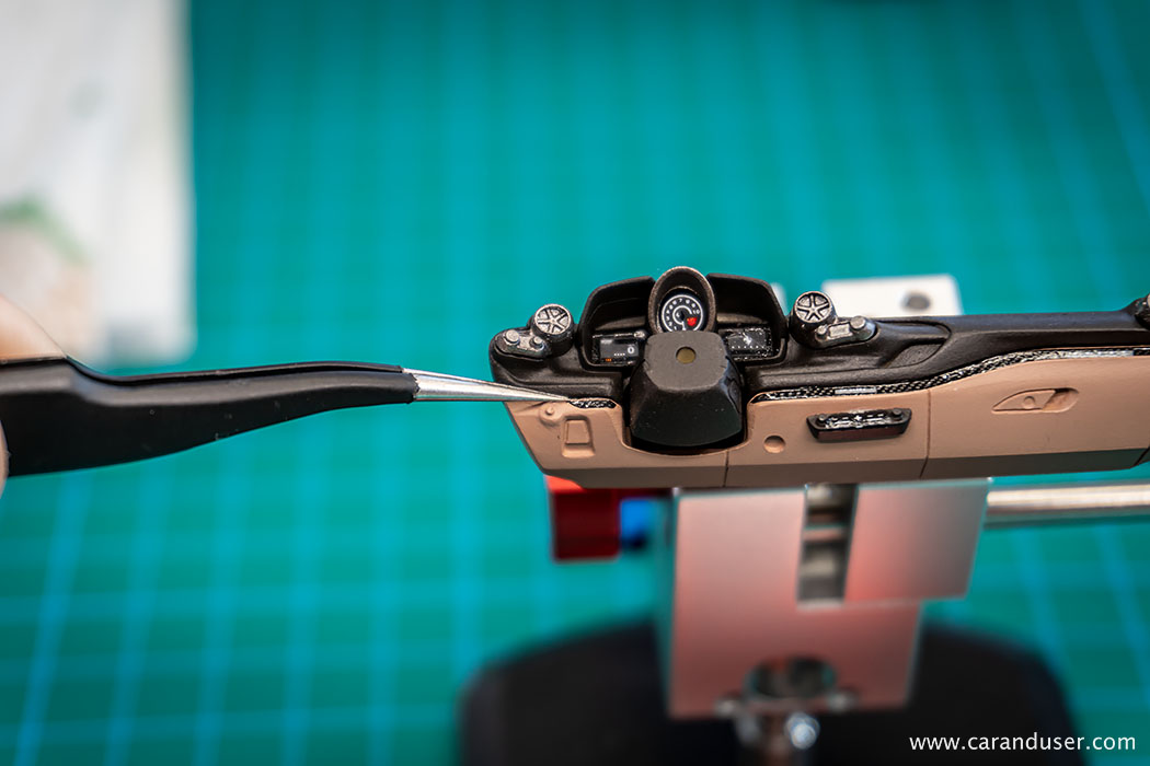 Po opravljenem barvanju kovinskih detajlov, namestimo sredinsko konzolo in usnjene preproge za voznika in sovoznika ter se lotimo lepljenja nalepk. Najprej se posvetimo manjšim detajlom, kot so kontrolne tipke za menjalnik, klimatsko napravo in avto sistem, števci ter nazadnje karbonska nalepka in emblem na volanu.