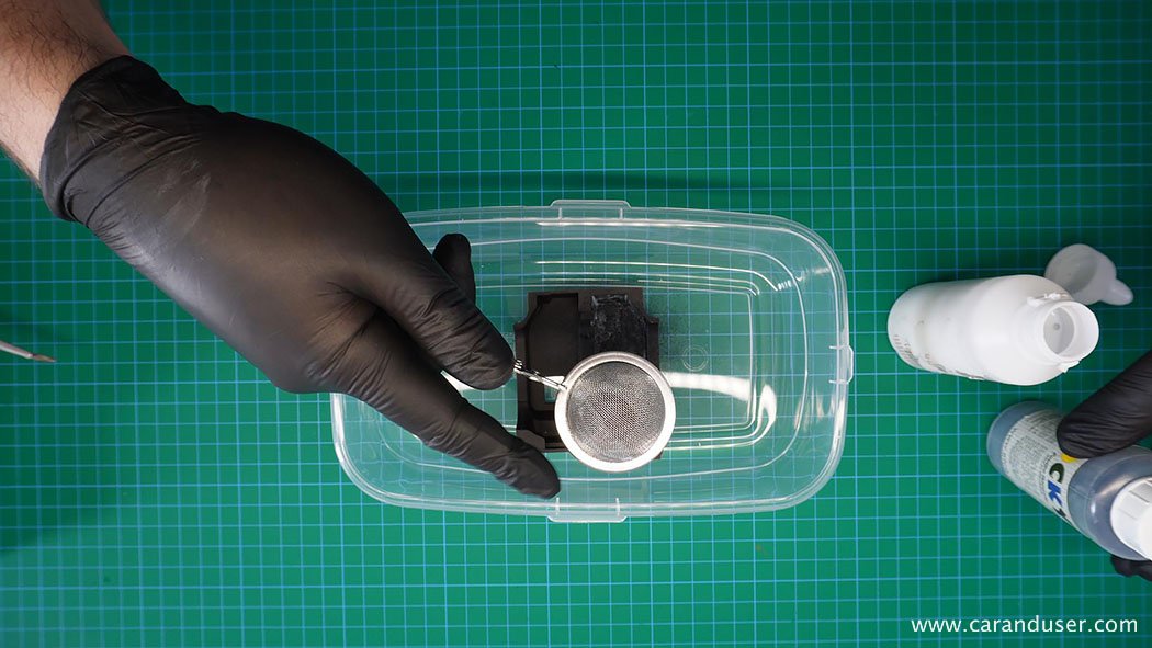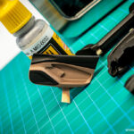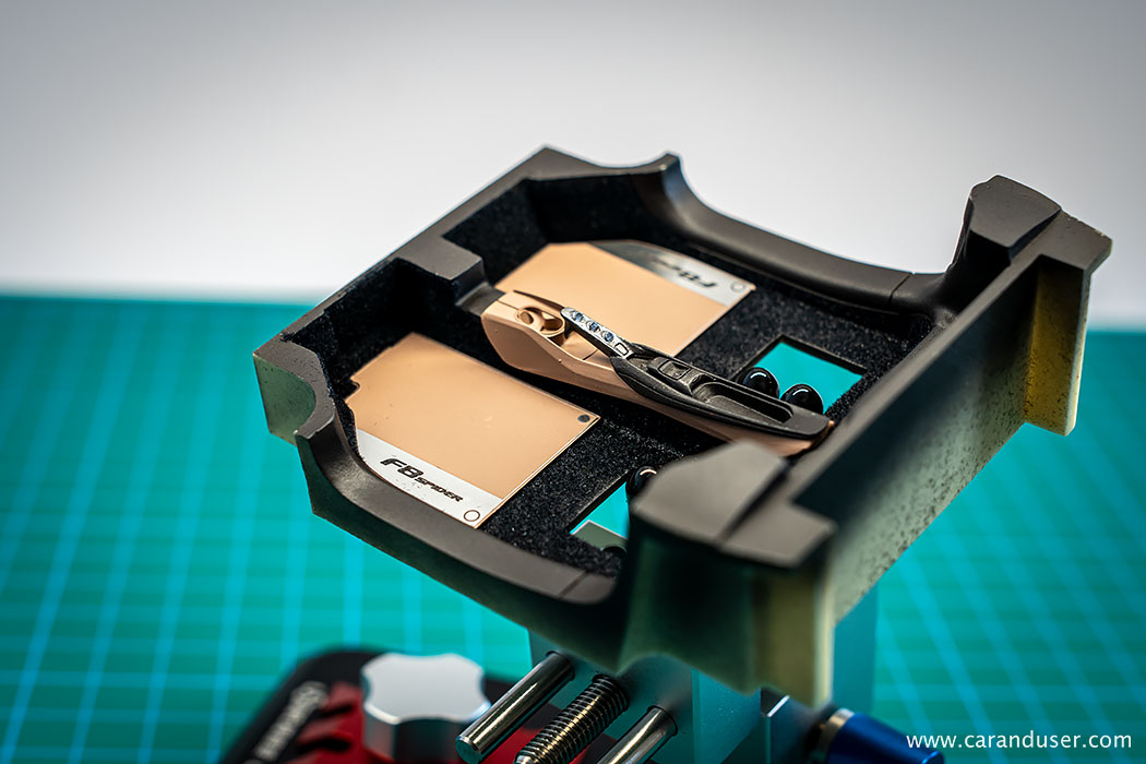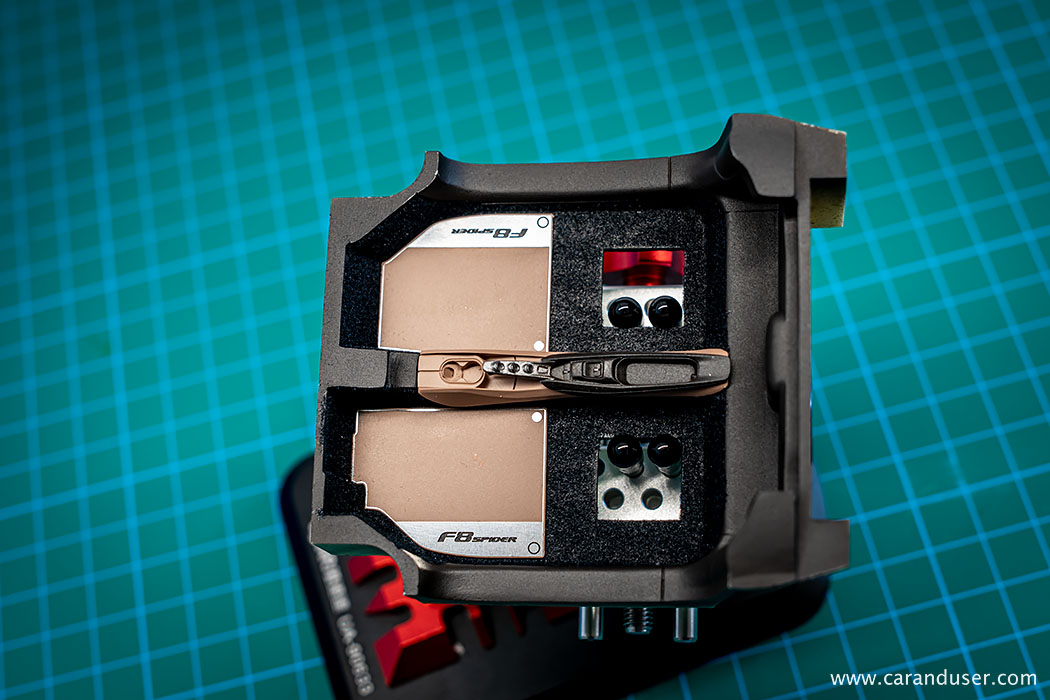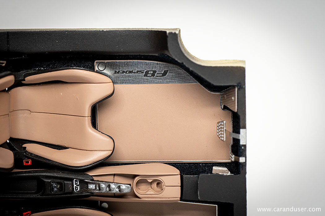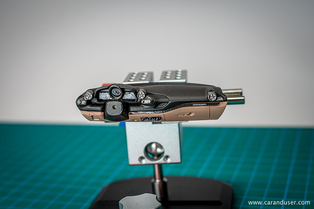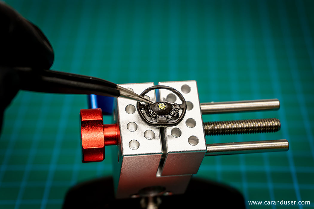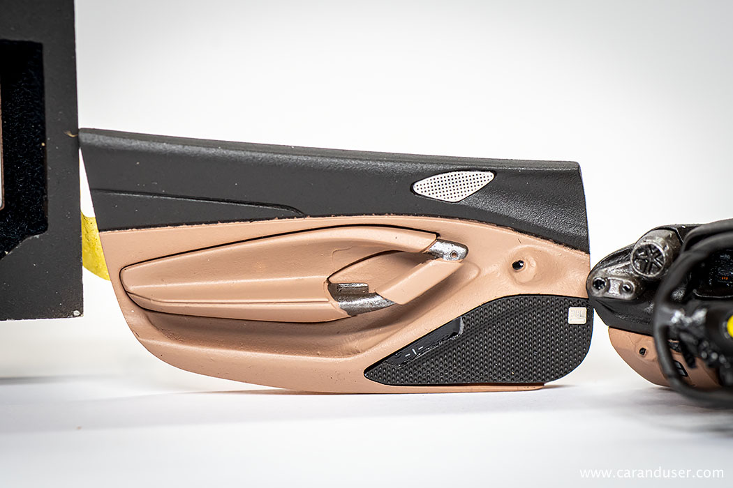 Po opravljenem barvanju kovinskih detajlov, namestimo sredinsko konzolo in usnjene preproge za voznika in sovoznika ter se lotimo lepljenja nalepk. Najprej se posvetimo manjšim detajlom, kot so kontrolne tipke za menjalnik, klimatsko napravo in avto sistem, števci ter nazadnje karbonska nalepka in emblem na volanu.
