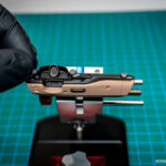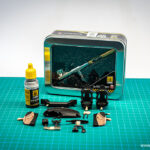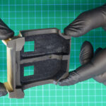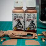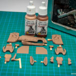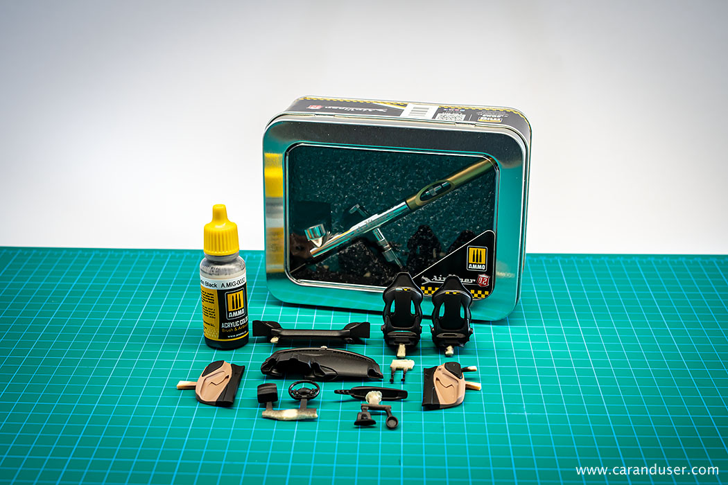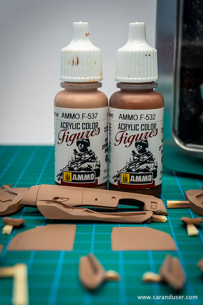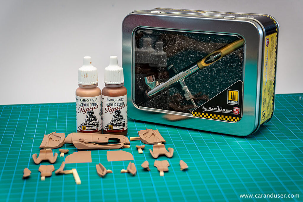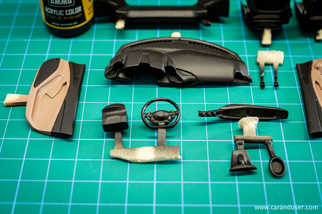 Sam postopek izdelave začnemo z izbiro ustrezne barve notranjosti in ker na trgu nismo našli pravega odtenka, smo le-tega ustvarili sami. Za svetlo rjavo notranjost smo tako iz palete vodnih barv proizvajalca AMMO izbrali odtenka Sunny skintone in Red Brown ter ju zmešali v razmerju približno 1:1. S to dobljeno barvo smo pobarvali vse sestavne dele notranjosti, kjer bo primarna barva svetlo rjava. Po sušenju barve je sledilo maskiranje nekaterih delov notranjosti in barvanje z uporabo AMMO pol-mat črne barve, tako smo dobili ustrezne barve naše tokrat kontrastne dvobarvne notranjosti.
