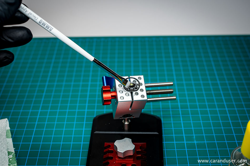 Pri nameščanju vseh nalepk, še posebej pa največjih na hrbtni strani sedežev, si pomagamo z uporabo tekočin za mehčanje nalepk AMMO Decal Fix in Deca Set ter njihovega posebnega čopiča za nameščanje in glajenje nalepk. Vse izdelke proizvajalca AMMO so nam priskrbeli pri podjetju miniatures.si , vse podrobnosti nameščanja nalepk in sestave notranjosti pa si lahko pogledate v priloženem videu: