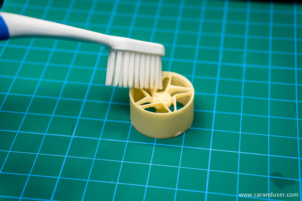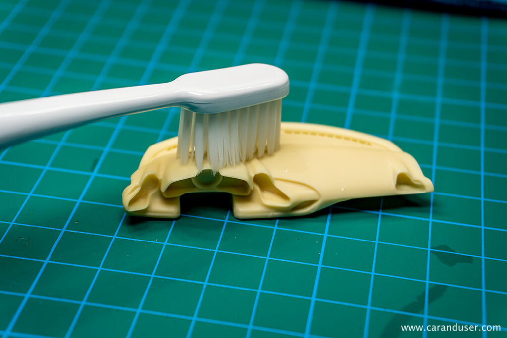 Za ta postopek potrebujemo toplo vodo, sredstvo za ročno pomivanje posode in različne zobne krtačke. Resinske kose pomočimo v milnico, težko dostopna mesta pa skrtačimo, vse skupaj na hitro speremo in postavimo na krpo, da odvečna milnica odteče. Za še dodatno mero previdnosti, obrišemo karoserijo s krpo napojeno z Lesonalovim redčilom za vodne barve, ki je hkrati tudi sredstvo za razmaščevanje.
