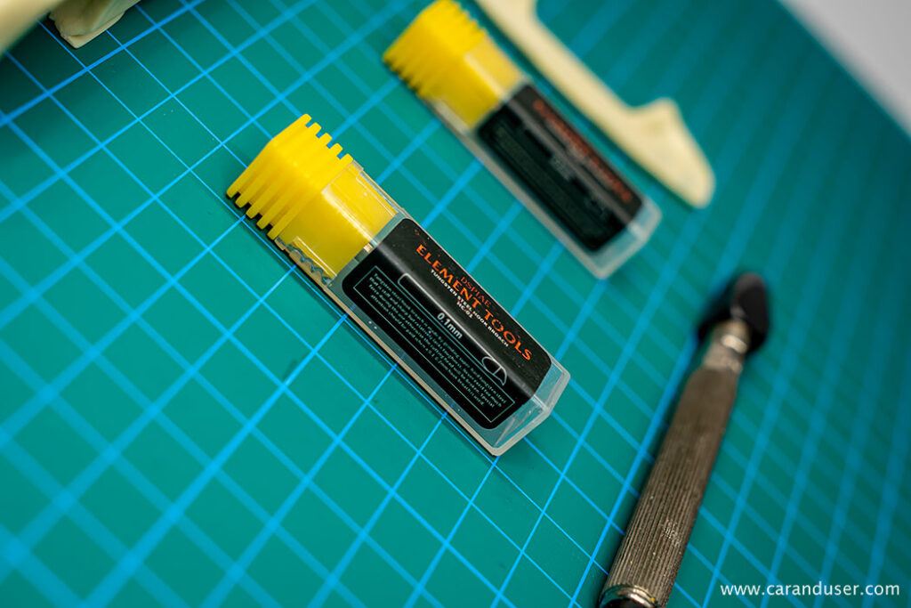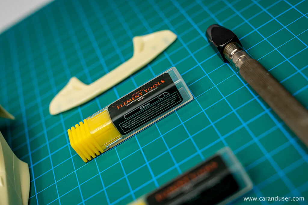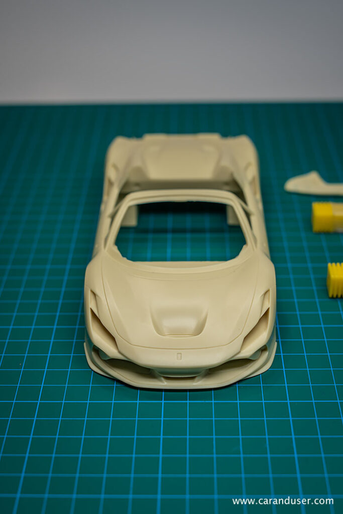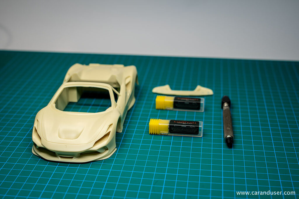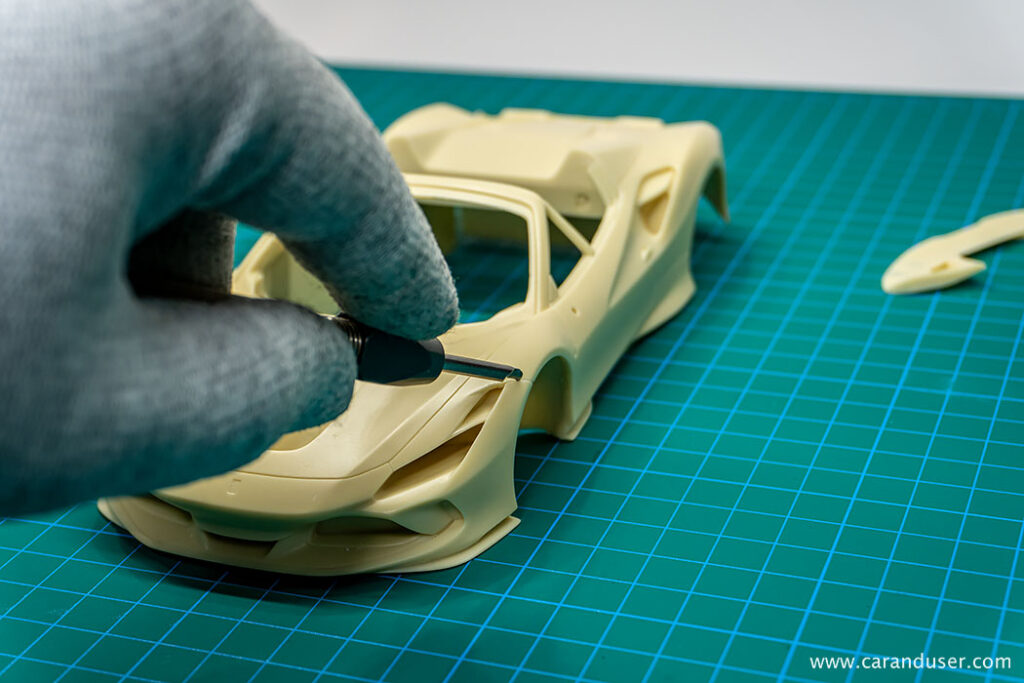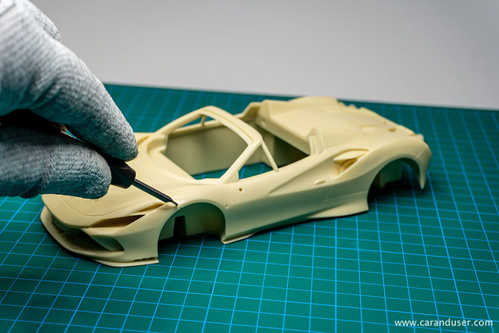 Ko se vsi resinski deli posušijo, nadaljujemo z globljenjem panelnih rež. Tudi pri maketi Ferrarija F8 Spider so linije na karoseriji ostre in različnih debelin, vendar nekoliko plitve za nadaljnji postopek karoserijske obdelave.