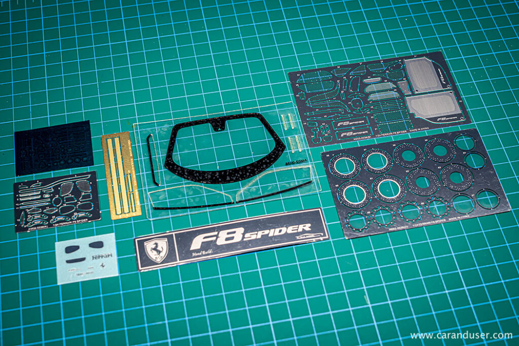 S pregledom resinskih delov smo končali in verjetno ste ugotovili, da tokrat manjka en sklop. Glavni krivec za pomanjkanje pogonskega sklopa je Ferrari, saj so prisilno polnjen V8 agregat skrili pod pokrov brez steklenega okna. Zato s pregledom nadaljujemo z nalepkami. Takoj opazimo, da je nalepk precej manj kot pri SF90, pri tem je vseeno potrebno poudariti, da imamo vse karbonske nalepke za notranji kot tudi zunanji karbonski paket. Nalepke tudi tokrat navdušujejo s kakovostjo, pri čemer lahko sklepamo, da nanašanje le-teh ne bo preveč zahtevno.