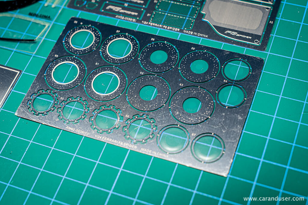 Do konca nam ostaneta le še dva sklopa, prozorni in kovinski deli ter navodila. Pustimo navodila za konec in se lotimo kovinskih in prozornih delov. Tudi tokrat so so priložena stekla izdelana iz acetatne folije, lasersko razrezana in z obarvanimi robovi. Kovinski deli pa vsebujejo zavorne kolute, običajne dodatke v notranjosti in tokrat tudi predpražnike.