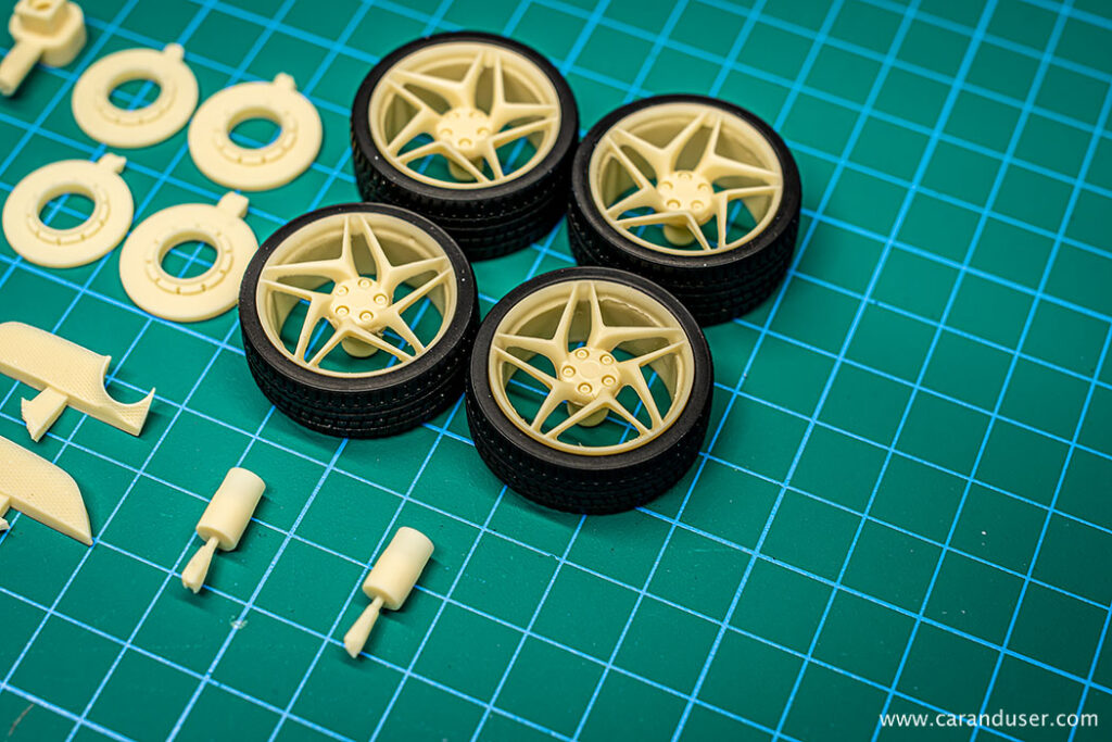 Po odprtju škatle na hitro pregledamo celotno vsebino in vse sestavne dele položimo na podlago. Takoj opazimo, da tokrat pri Alpha Model niso bili tako radodarni kot pri SF90 in nam ne ponudijo možnosti izbire sedežev in platišč.