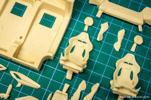 Tokratni projekt bomo začeli malce drugače kot pretekle, kjer smo začeli z izdelavo karoserije, zato najprej odpremo in detajlno pregledamo vse sestavne dele notranjosti makete. Kot smo že omenili, so pri Alpha Model tokratni maketi namenili “le” športne karbonske sedeže, kljub temu pa so zelo smiselno razdelili sestavne dele, da maketarjem pri izdelavi omogočajo lažje in boljše detajliranje.