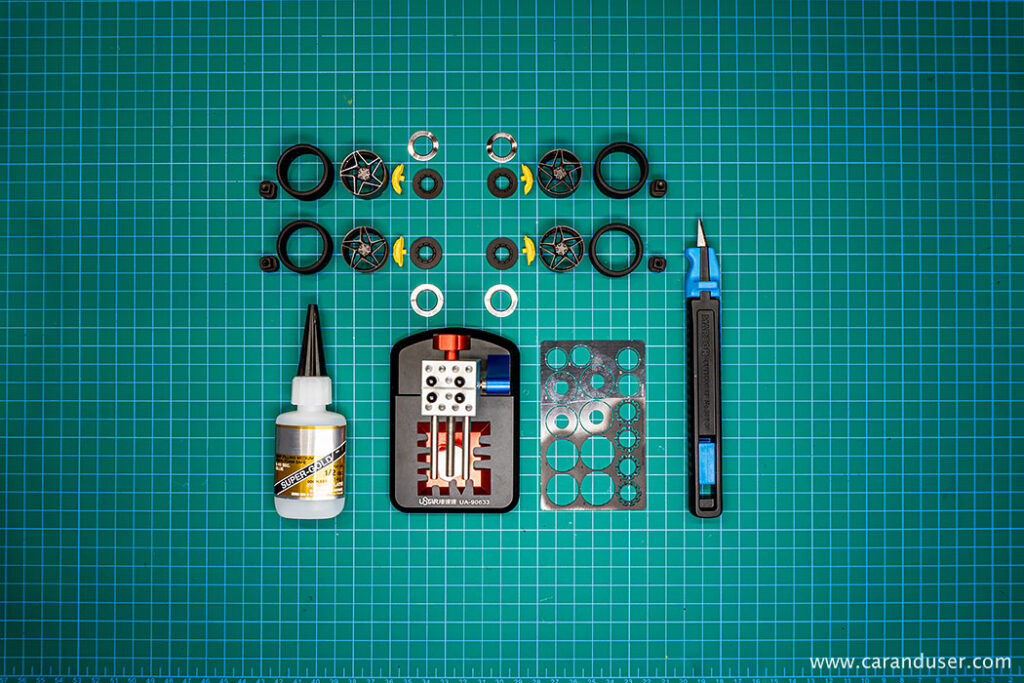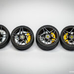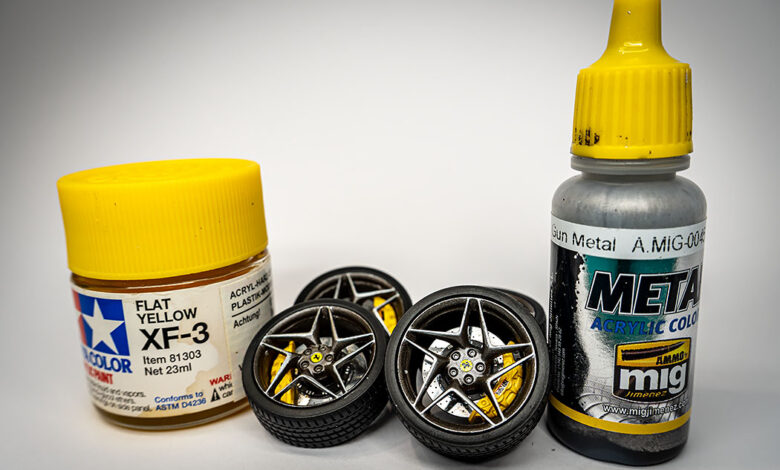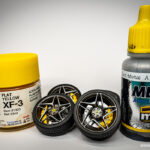 Tokratni prispevek bo, glede na majhno število sestavnih delov, kratek. Začne pa se kot po navadi z barvanjem. Tokrat najprej vse sestavne dele, razen platišč in zavornih čeljusti, pobarvamo z mat črno barvo proizvajalca AMMO, platiščem namenimo Gun metal odtenek, zavorne čeljusti pa odenemo v živo rumeno barvo proizvajalca Tamiya.