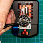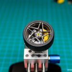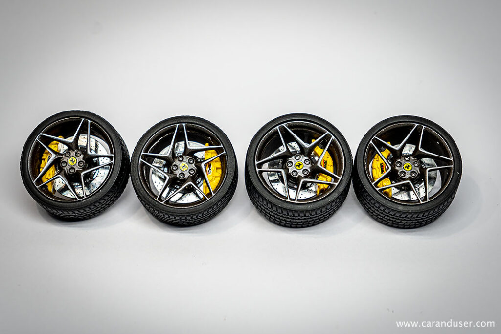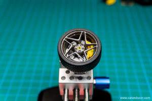 S tako obdelanimi zavornimi diski in pobarvanimi ostalimi sestavnimi deli nadaljujemo z izdelavo zavor. Na resinske osnove diskov nalepimo kovinske obloge in vse skupaj namestimo na kvadre kateri bodo služili namestitvi koles na karoserijo. Na omenjene kvadre se namestijo tudi zavorne čeljusti in za konec čeljustim dodamo še Ferrarijeve embleme. Zavore in bloki za namestitev so tako končani, do zaključka sklopa o “podvozju” tako manjka samo še namestitev platišč.