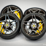 Da zaključimo tokratni sklop, na sredino platišč namestimo Ferrarijeve embleme in vse skupaj skrbno shranimo do koraka končne montaže naše makete.