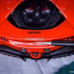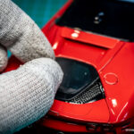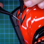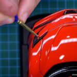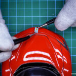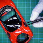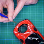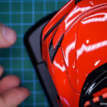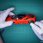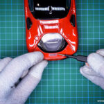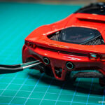 Z nameščenimi stekli smo skoraj pri koncu izdelave našega Ferrarija, da mu dodamo še zadnje detajle namestimo stranska ogledala, zadnji difuzor, zaključke izpuhov in vse ikonične embleme.
