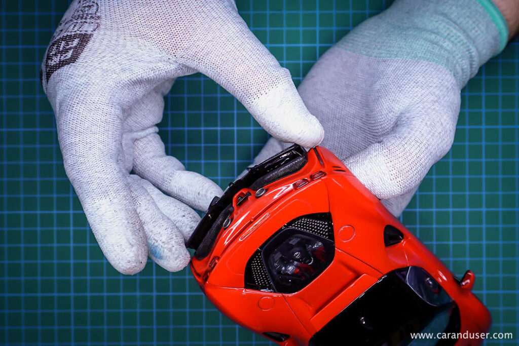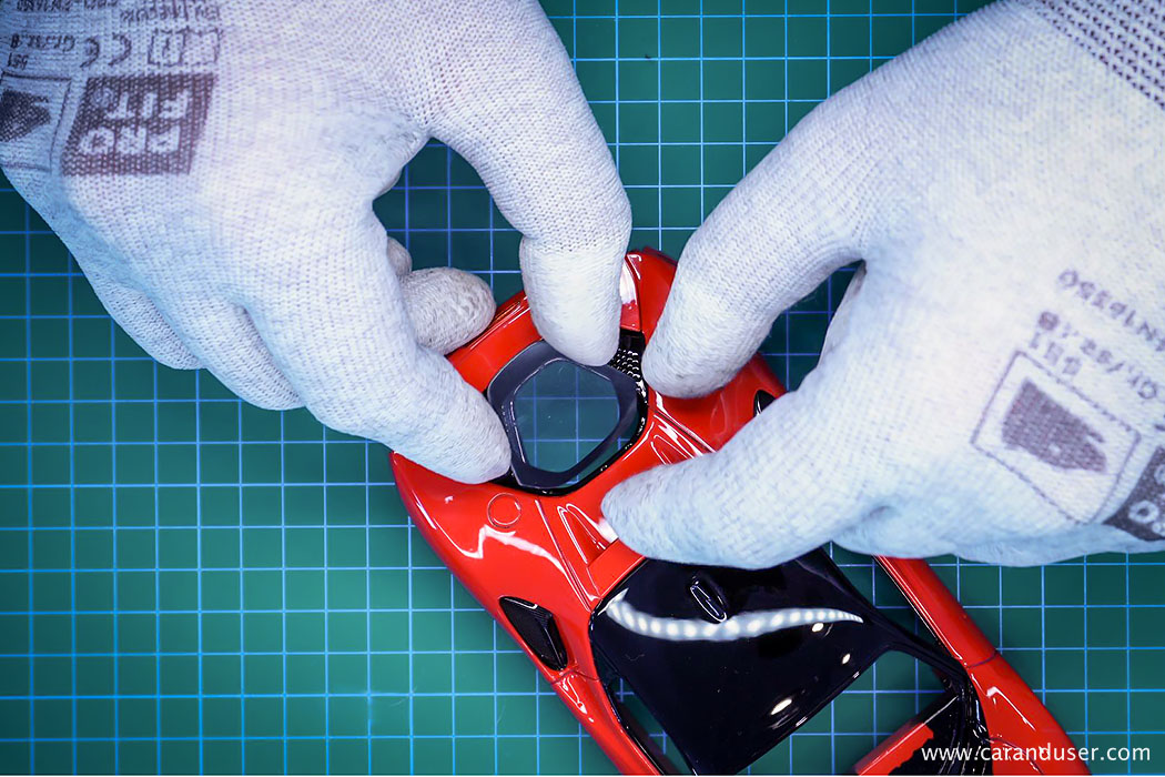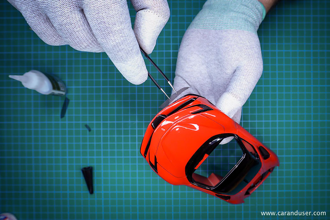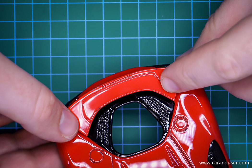Odgovor je ne! Pa ne zaradi drugačnih stekel ali načina nameščanja koles, ampak predvsem zaradi izkušenj. Če smo pri Singerju DLS in Bugatti Chironu edini pravi graji namenili steklom in nameščanju koles, katerih smo se tudi tokrat lotili z malce spoštovanja in kar malce zavlačevali s tema korakoma, smo, ko je kljub vsemu prišlo do njih, z nekaj predznanja in izkušnjami ugotovili, da je tokrat pravzaprav najtežji korak nameščanje zadnji prezračevalnih mrežic. Ampak gremo lepo po vrsti.