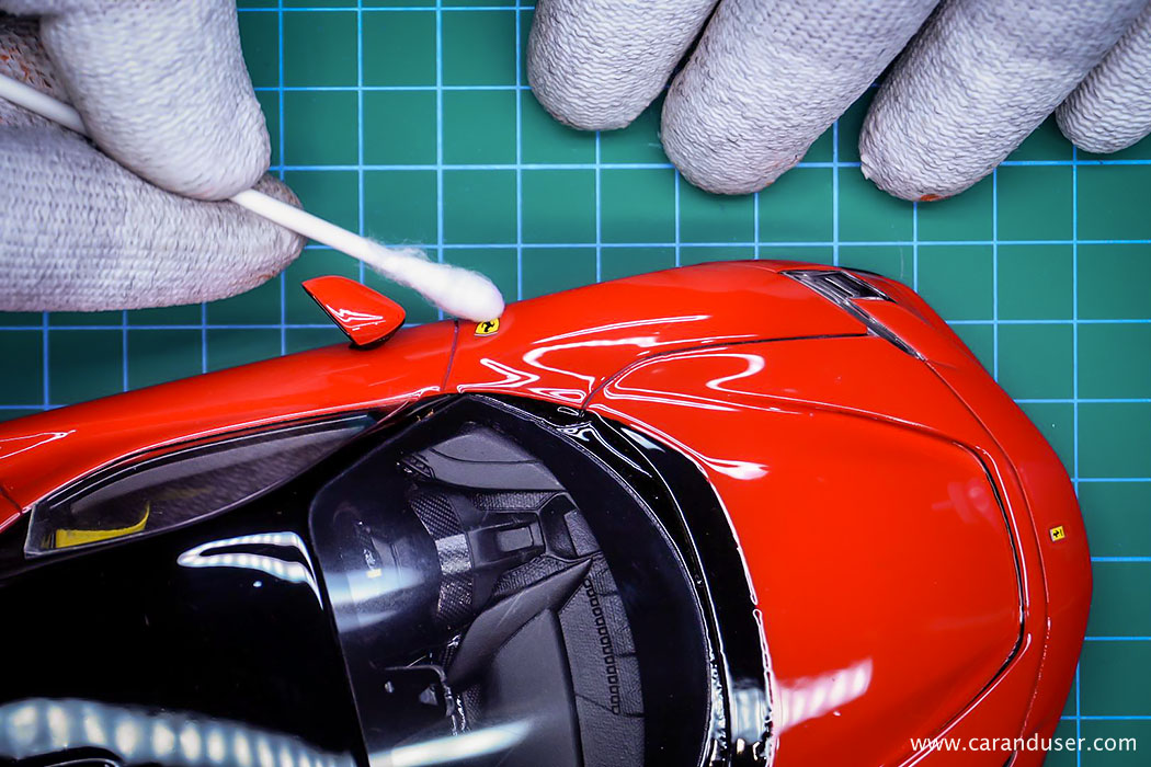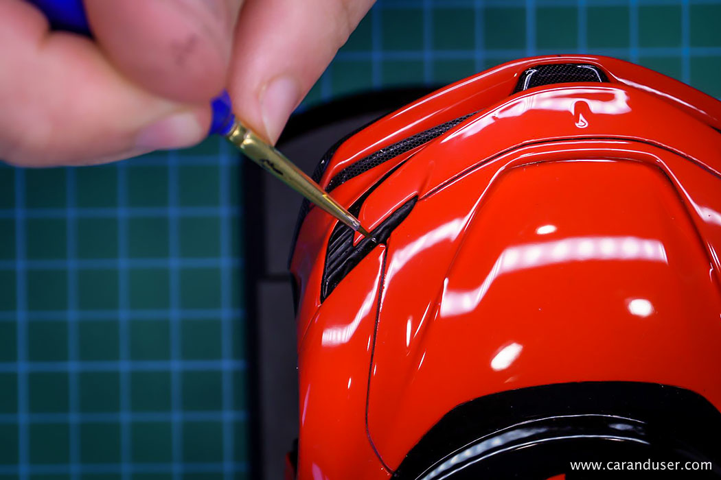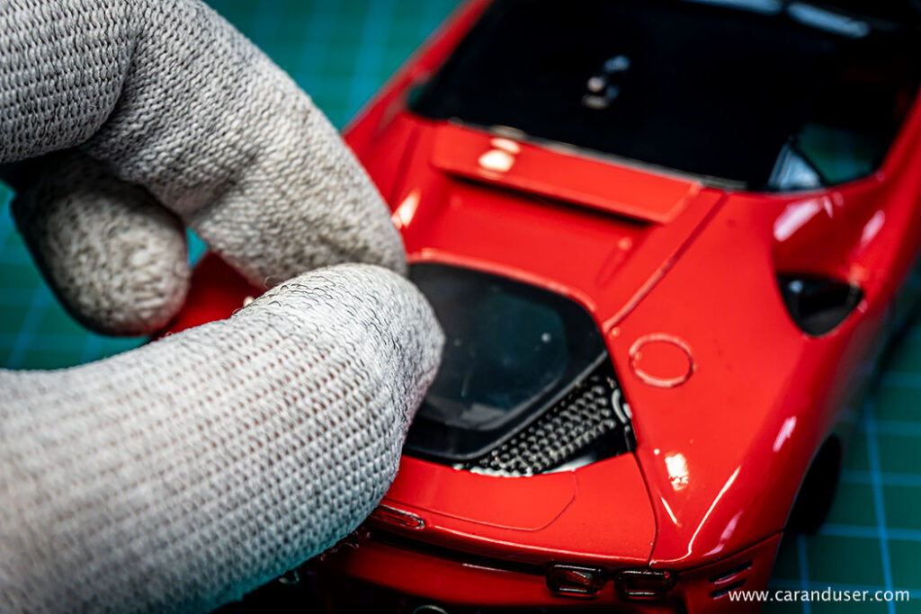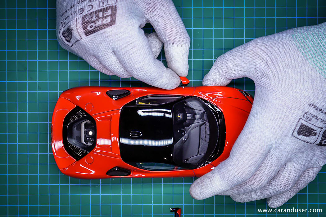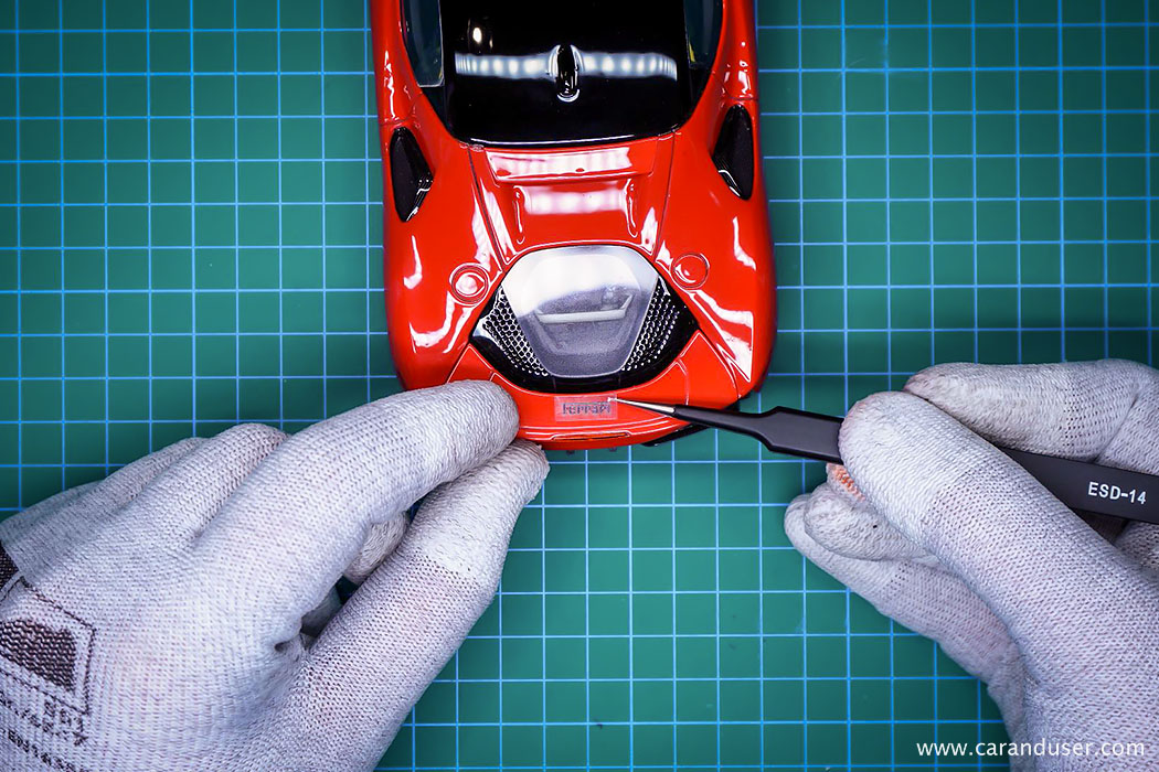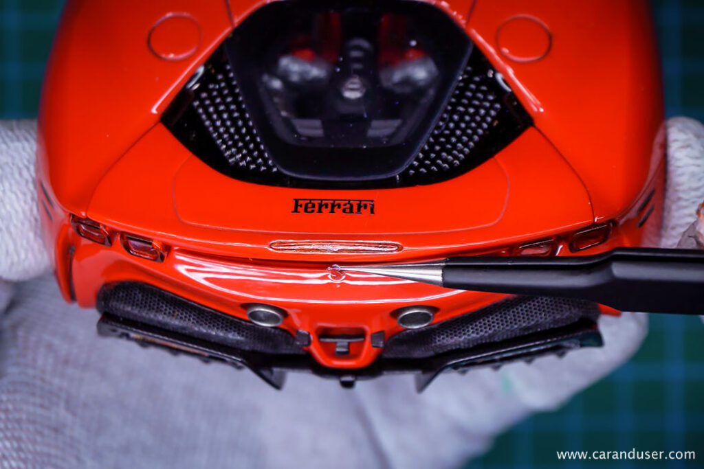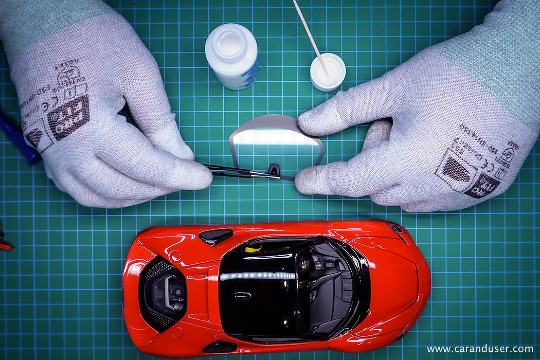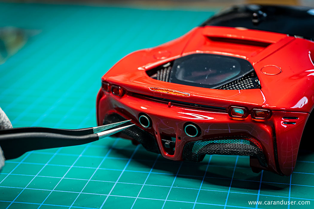 Z nameščenimi stekli smo skoraj pri koncu izdelave našega Ferrarija, da mu dodamo še zadnje detajle namestimo stranska ogledala, zadnji difuzor, zaključke izpuhov in vse ikonične embleme.