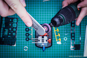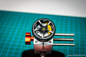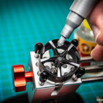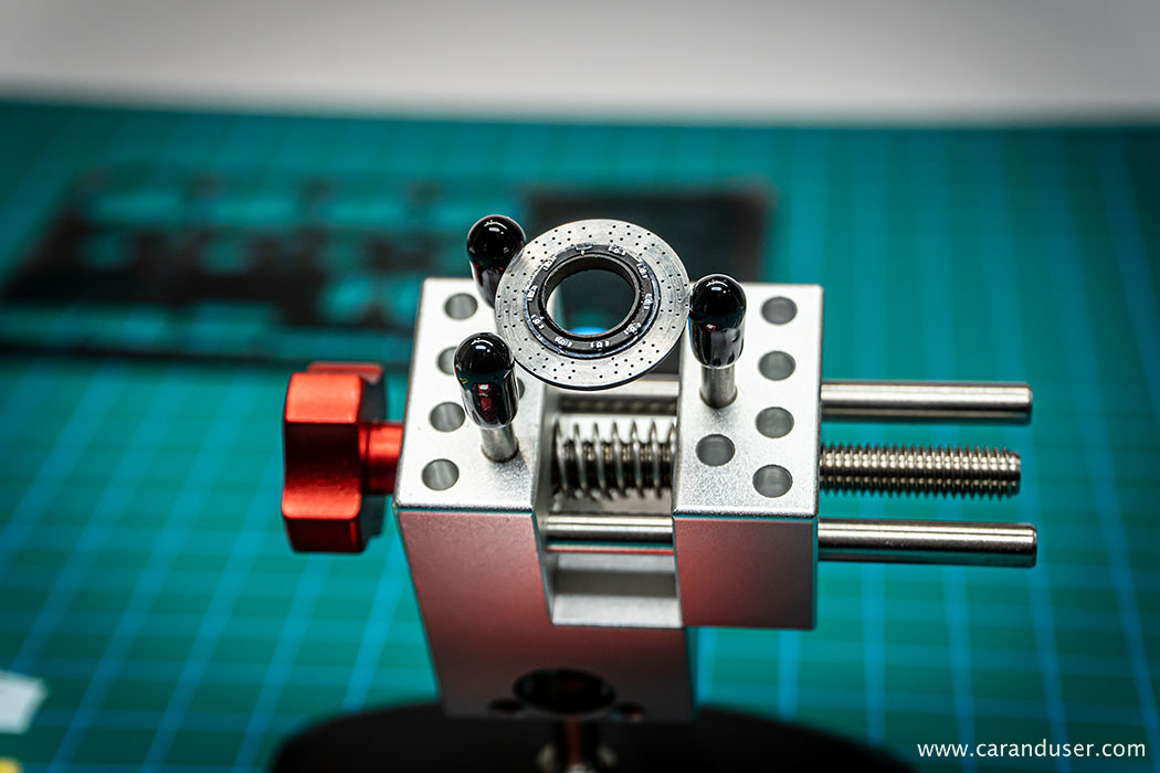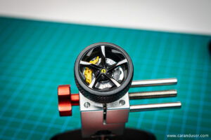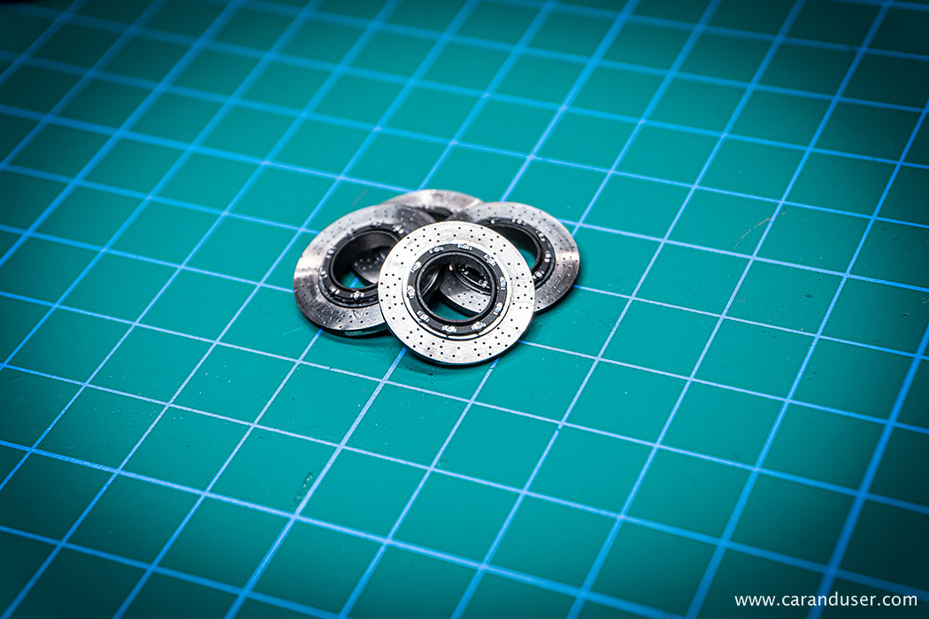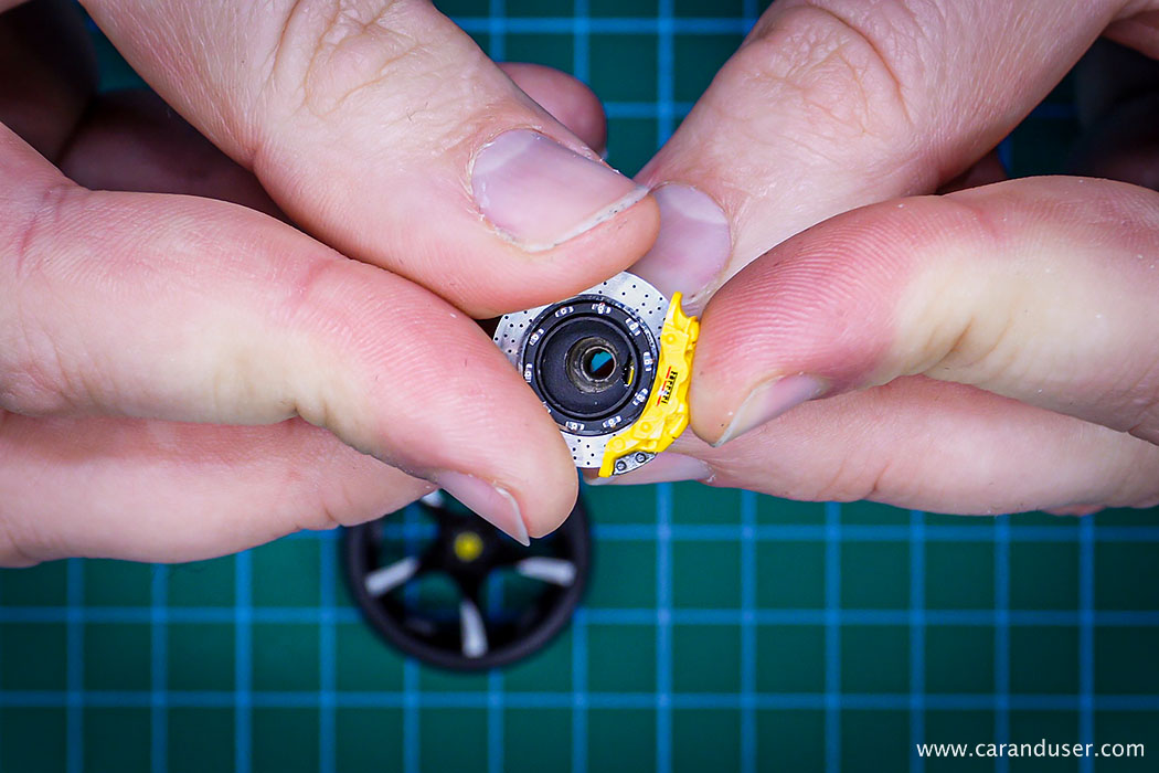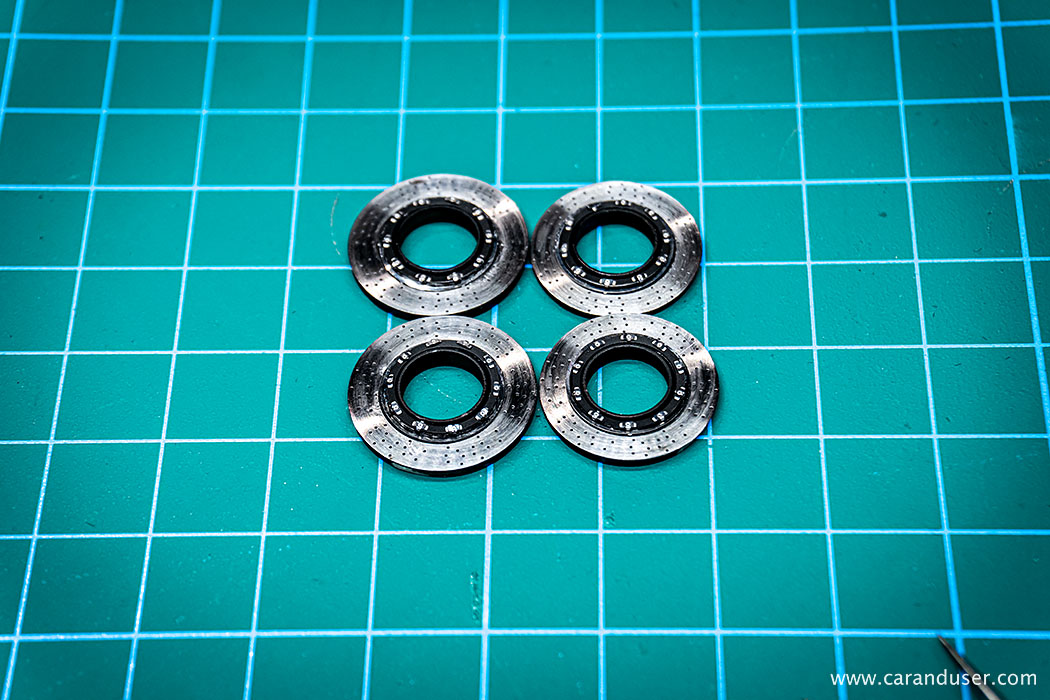 Tudi tokrat so pri Alpha Model vključili kovinske zavorne kolute, ker pa so surovi zavorni koluti videti precej svetleče in so na njih prezračevalne luknje skoraj nevidne, smo jih v koraku barvanja prav tako pobarvali z mat črno barvo. Tako obarvane kolute namestimo na vrtalnik in jim s pomočjo pilice za nohte zagotovimo malce “obrabe”, postopek obdelave zavornih kolutov in ostale detajle tokratnega prispevka si lahko, kot ponavadi, ogledate v priloženem videu.
