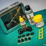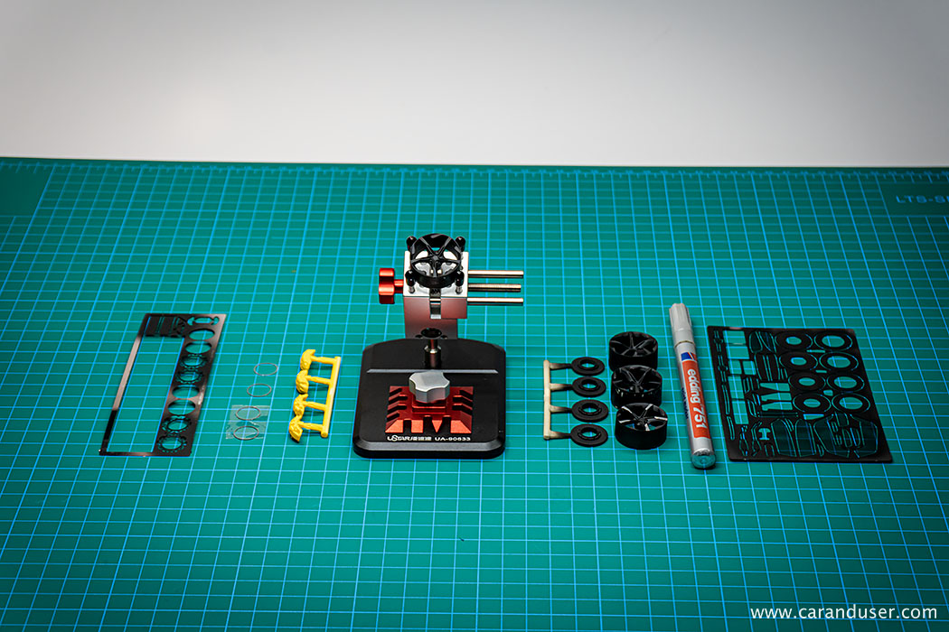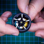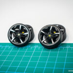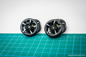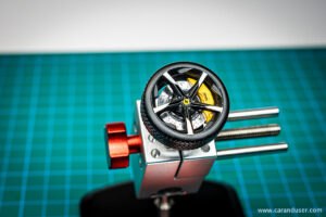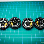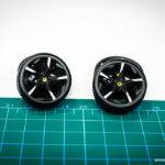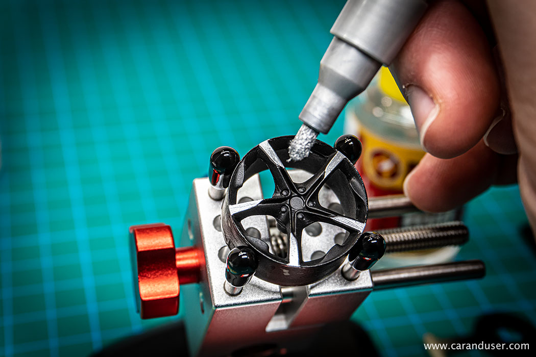 Z vsemi sestavnimi deli, odetimi v njihovo osnovno barvo, pa se postopek izdelave podvozja pravzaprav šele začne. Tako je naslednji korak detajliranje platišč. Kot smo že omenili v unboxingu naše makete, je proizvajalec Alpha Model vključil možnost izbire različnih platišč, mi pa smo se odločili za uporabo tistih z bolj agresivnim videzom. Prav ta platišča pa so ponavadi odeta v dvo-barvno kombinacijo. Tako smo z uporabo posebnega markerja na mat črni osnovi naredili kromirane poudarke na platiščih.