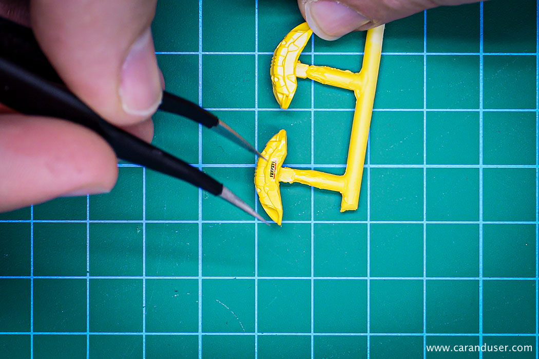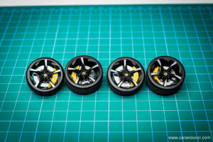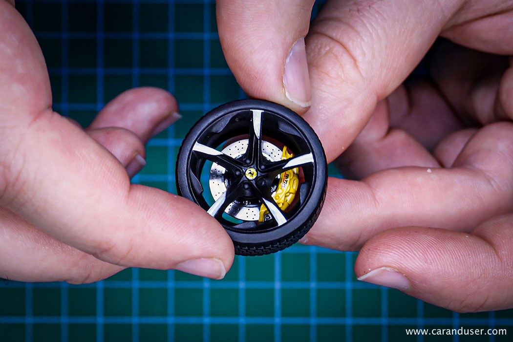 Sedaj pa na vrsto pridejo zavorne čeljusti, na živo rumene zavorne čeljusti naprej dodamo Ferrarijeve logotipe in na zadnjem paru s čopičem pobarvamo še nekaj detajlov.