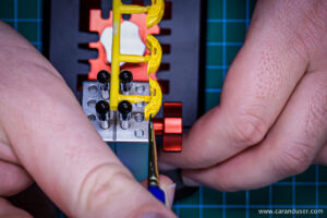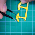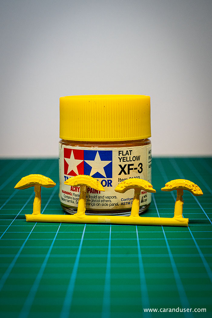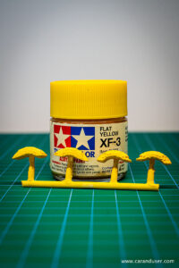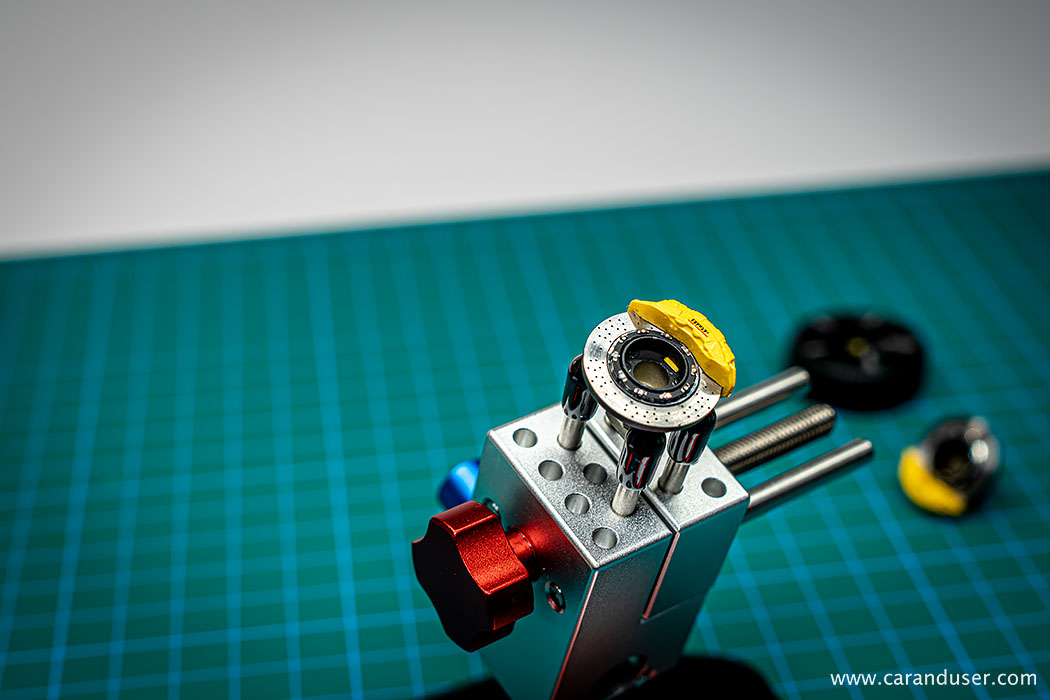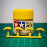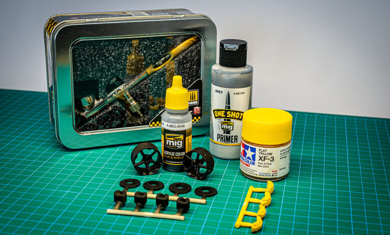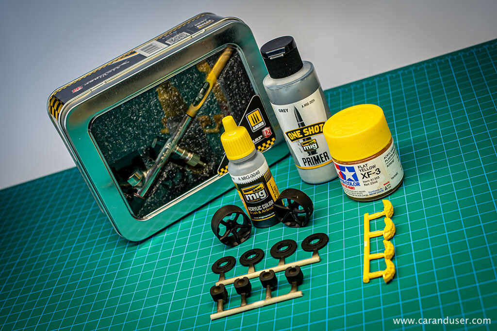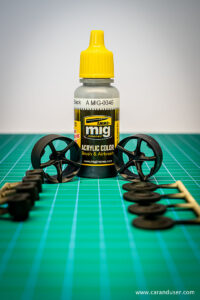 Tako smo z novo pridobljenim airbrushem in uporabo AMMO by Mig One Shot sivega primerja zagotovili enakomerno in obstojno podlago, na katero smo nanesli mat črno barvo na vodni osnovi istega proizvajalca in za zagotavljanje kontrasta zavorne čeljusti odeli v rumeno barvo z uporabo Tamiyine barve v odtenku XF-3.