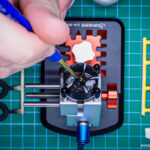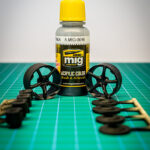 Naslednji korak je nameščanje logotipov v sredino platišč, za kar smo uporabili AMMO by Mig Decal Set tekočino in z vatirano palčko kasneje odvečno tekočino tudi odstranili. Da zagotovimo svetleč izgled logotipov na vsakega nanesemo kapljico svetlečega laka.