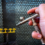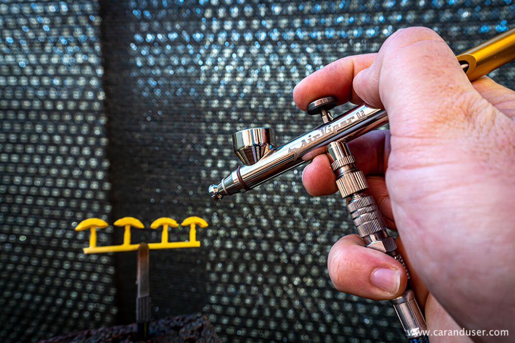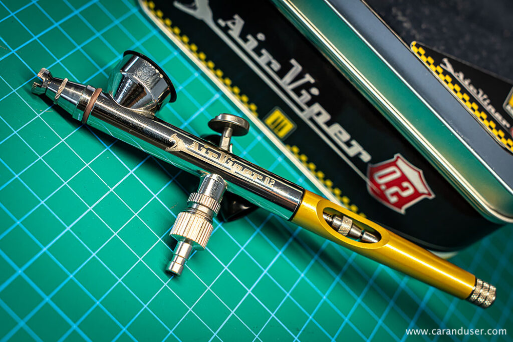 Celoten postopek izdelave pričnemo z barvanjem sestavnih delov podvozja. V ta namen tokrat nismo uporabili našega mr. Hobby zračnega čopiča kot za karoserijo in notranjost, temveč povsem novega. Odločitev o pridobitvi dodatnega airbrusha se je porajala že kar nekaj časa, saj kljub vrhunskosti našega mr. Hobby airbrusha, le-ta ni prvenstveno namenjen barvanju manjših in bolj detajlnih sestavnih delov. Tako smo si v ta namen pridobili airbrush z manjšo šobo in iglo, natančneje premera 0,2 mm (mr. Hobby ima premer 0,5 mm) in ker je izbor airbrushev milo rečeno ogromen, smo za nasvet malce pobrskali po spletu in naleteli na AMMO by Mig Jimenez Air Viper 0,2mm airbrush.