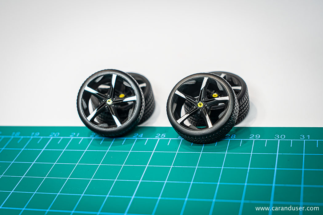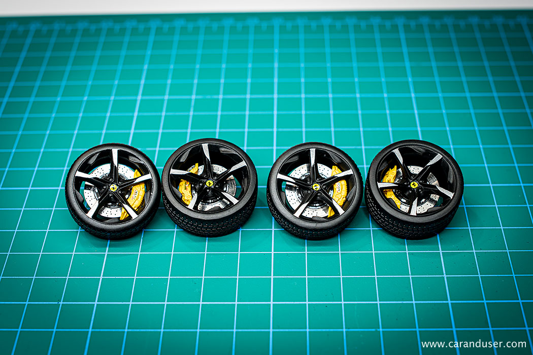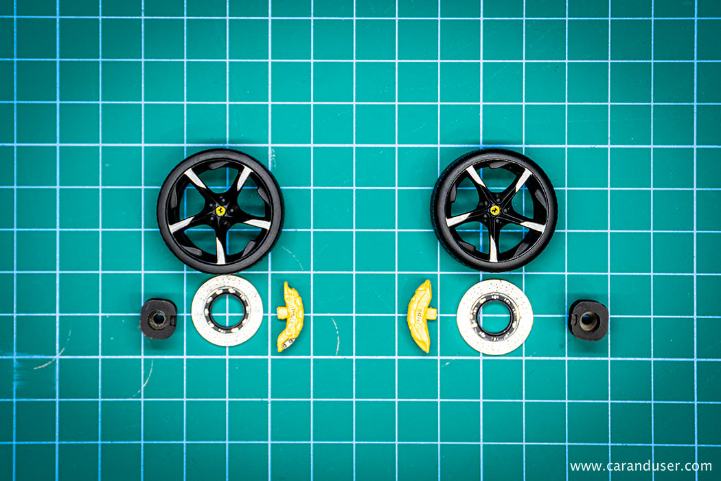 Sledi še zadnji del izdelave podvozja in ta obsega sestavo prejšnjih sklopov v celoto. Pri tem koraku bi nam bila običajno v veliko pomoč navodila za izdelavo makete saj bi tako precej lažje zagotovili pravilno ujemanje pritrdilnih kvadrov, zavornih čeljusti in pa koles, a ker so pri podjetju Alpha Model z navodili precej skopi, smo pomoč poiskali na spletu in z uporabo referenčnih fotografij pravega avtomobila le določili pravilne sestavne dele za posamezen vogal makete. Pri tem velja vseeno pohvaliti podjetje Alpha Model, saj so zagotovili tako levi kot desni par platišč in ne kot je navada pri cenejših maketah, da sta oba para enaka.