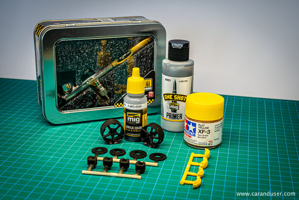 Tako smo z novo pridobljenim airbrushem in uporabo AMMO by Mig One Shot sivega primerja zagotovili enakomerno in obstojno podlago, na katero smo nanesli mat črno barvo na vodni osnovi istega proizvajalca in za zagotavljanje kontrasta zavorne čeljusti odeli v rumeno barvo z uporabo Tamiyine barve v odtenku XF-3.