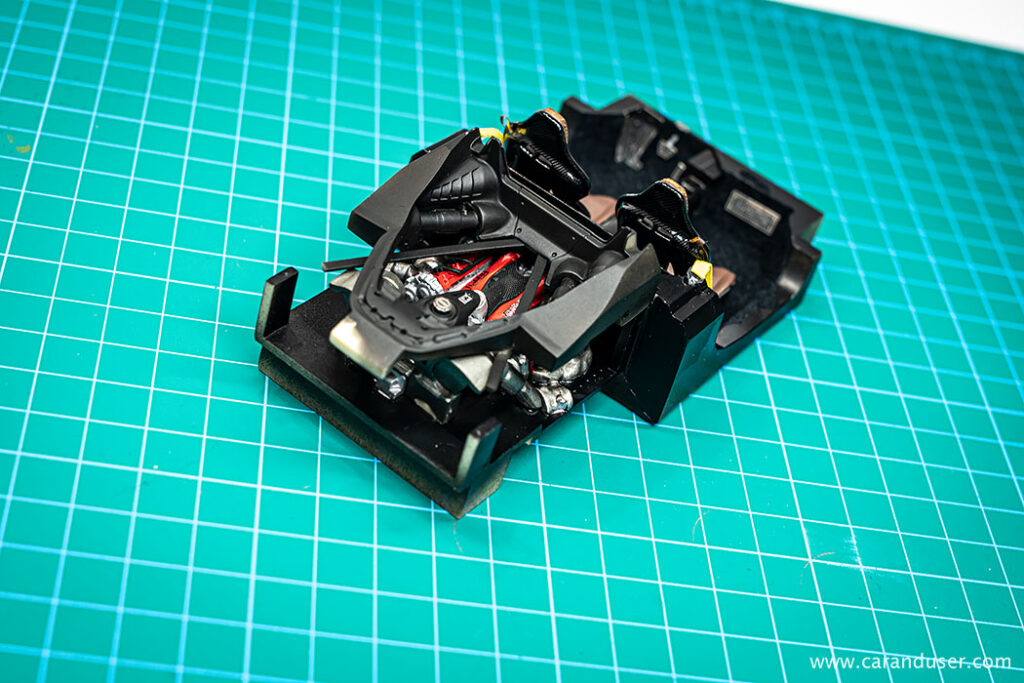 Vključili so glavne in najbolj vidne sestavne dele s katerimi, kljub pomanjkanju precejšnjega dela sestavin, vseeno dosežemo precej visok nivo detajliranosti tega dela naše makete. Tukaj je potrebno omeniti tudi dejstvo, da je Ferrari pogonski sklop v SF90 namestil tako nizko, da se tudi pri pravem avtomobilu skozi majhno zadnjo stekleno odprtino vidi bore malo.