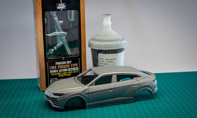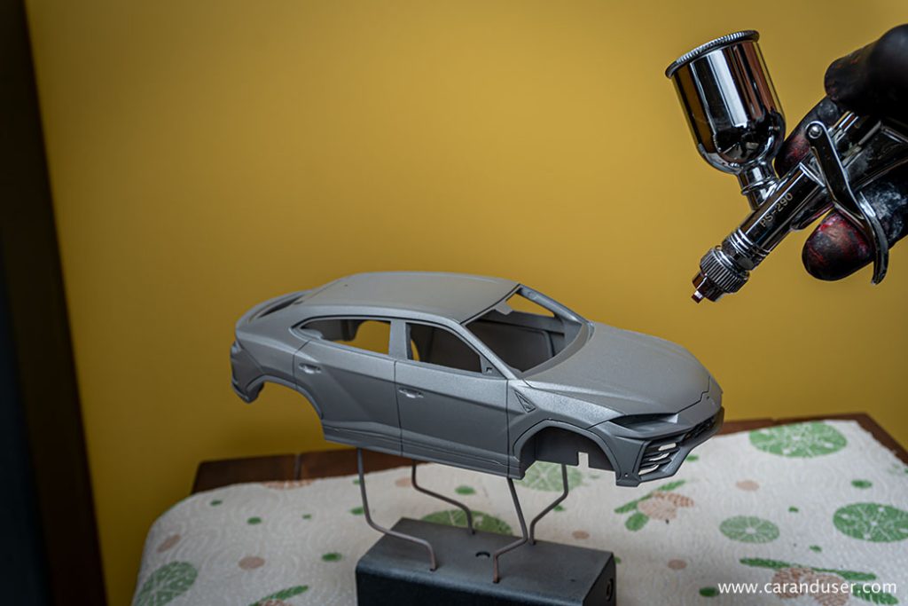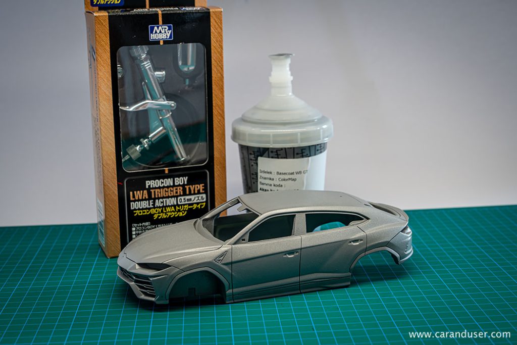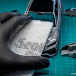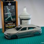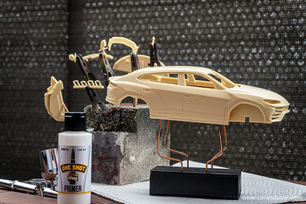 Da pridemo do končnega izgleda pa nas prej loči še nekaj korakov. Predhodno očiščeno in pobrušeno karoserijo in vse njej pripadajoče sestavne dele najprej odenemo v bel maketarski primer proizvajalca AMMO by Mig, ki so nam ga priskrbeli pri podjetju miniatures.si.
