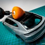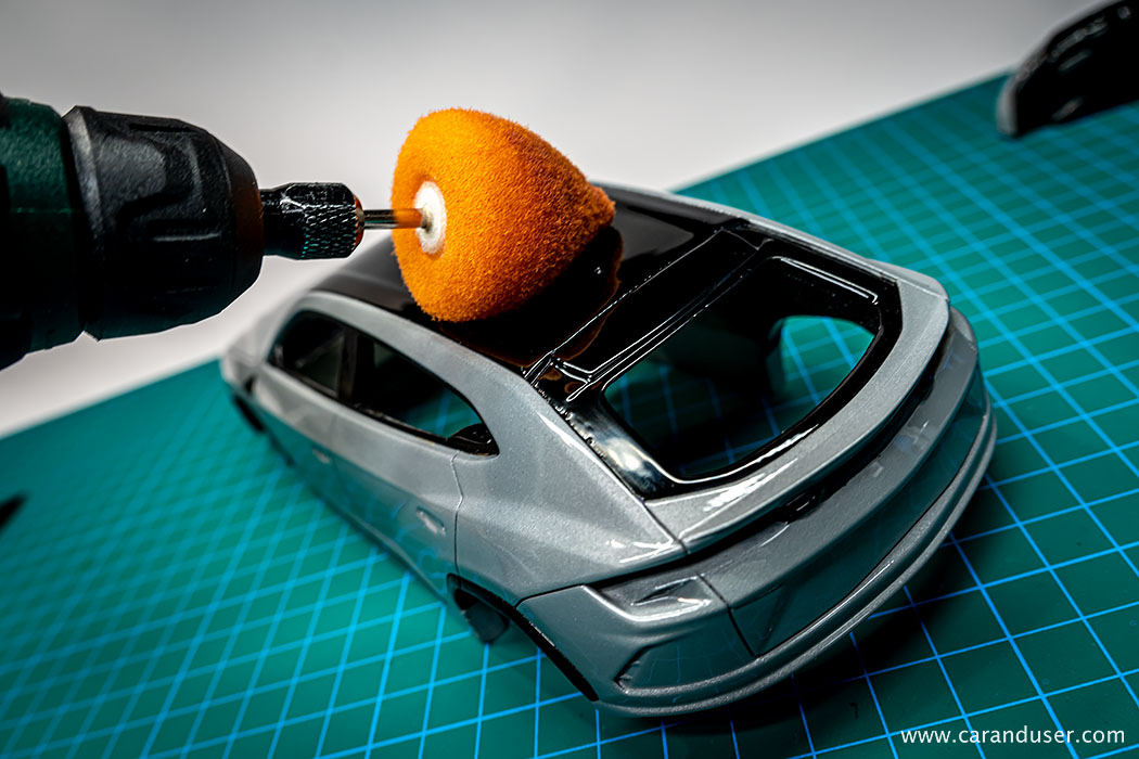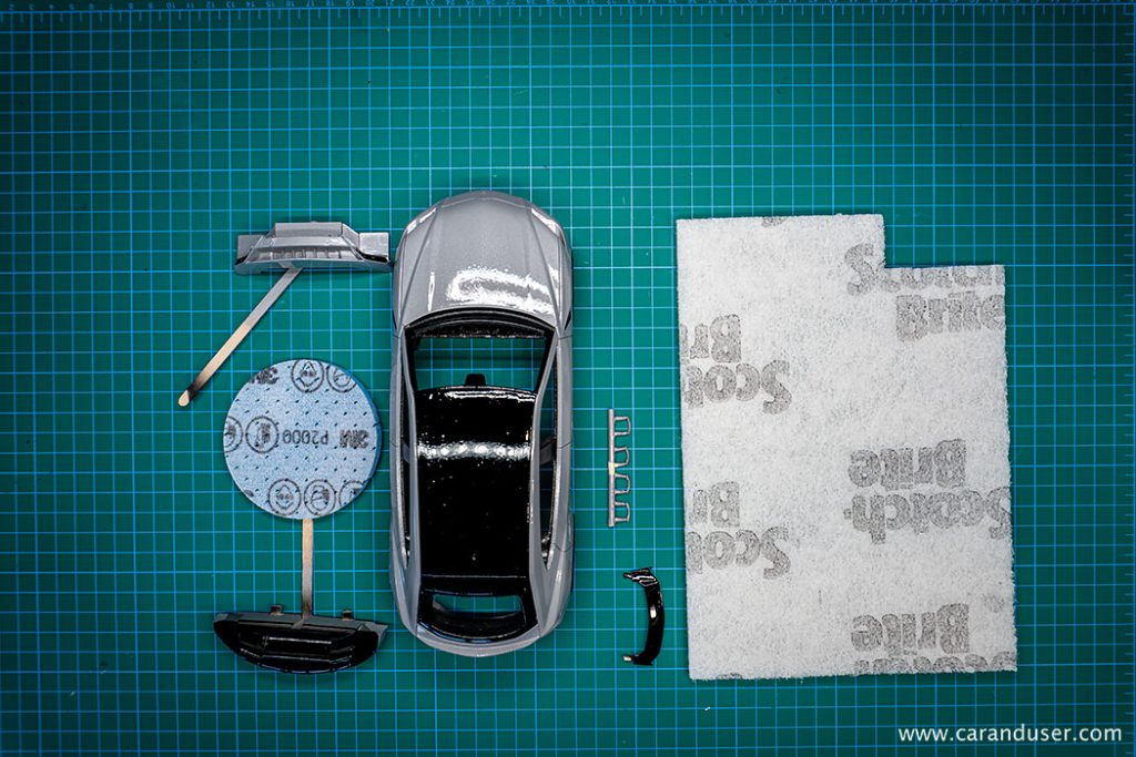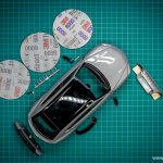 Da pa zadeva vendarle ne bo tako enostavna in monotona, po nekajdnevnem sušenju osnovne barve večino karoserije zaščitimo z maskirnim trakom, odkrite pa pustimo zgolj karoserijske dele ki so pri pravem avtomobilu kontrastne barve in jih je Alpha Model ulil skupaj z karoserijo. Dodamo še kanček svoje domišljije in odkrito pustimo tudi streho makete. Odkrite dele, kot tudi strešni spojler in vzvratna ogledala, pobarvamo s črno barvo in celotno karoserijo zaščitimo z lakom.