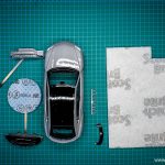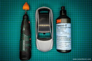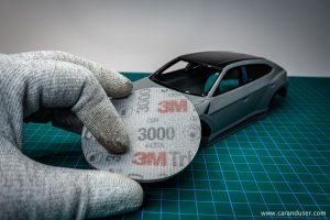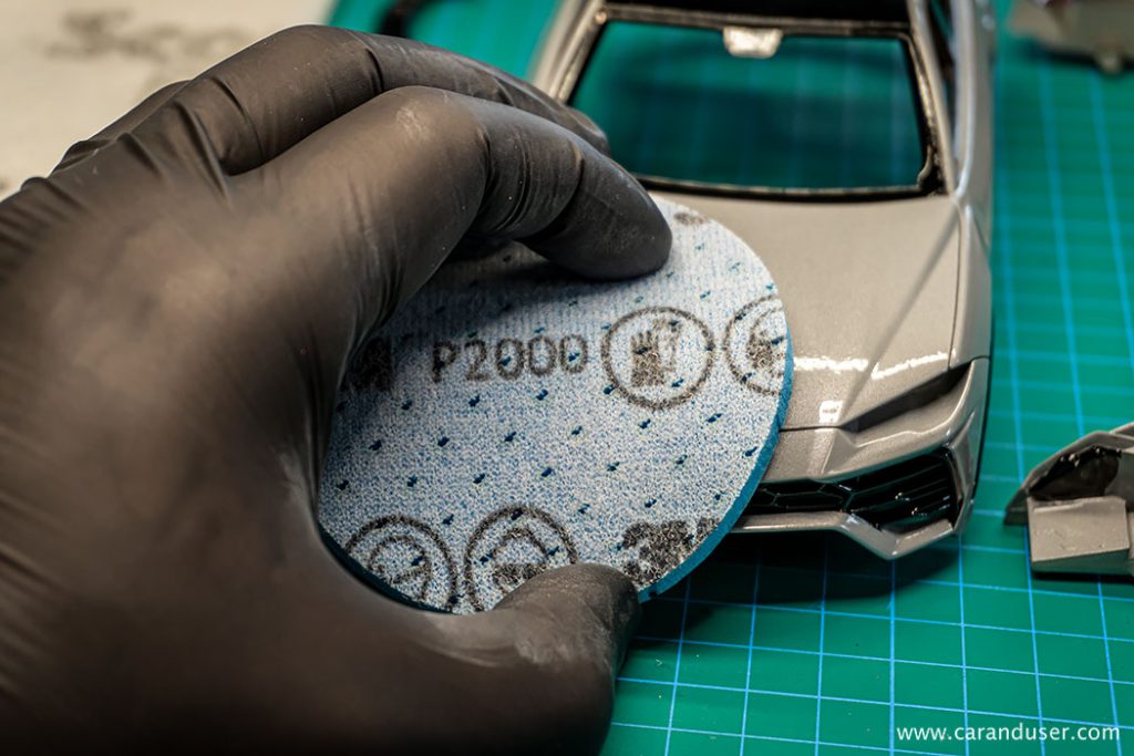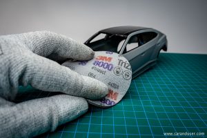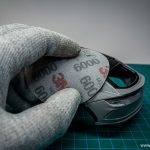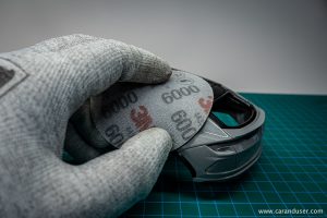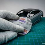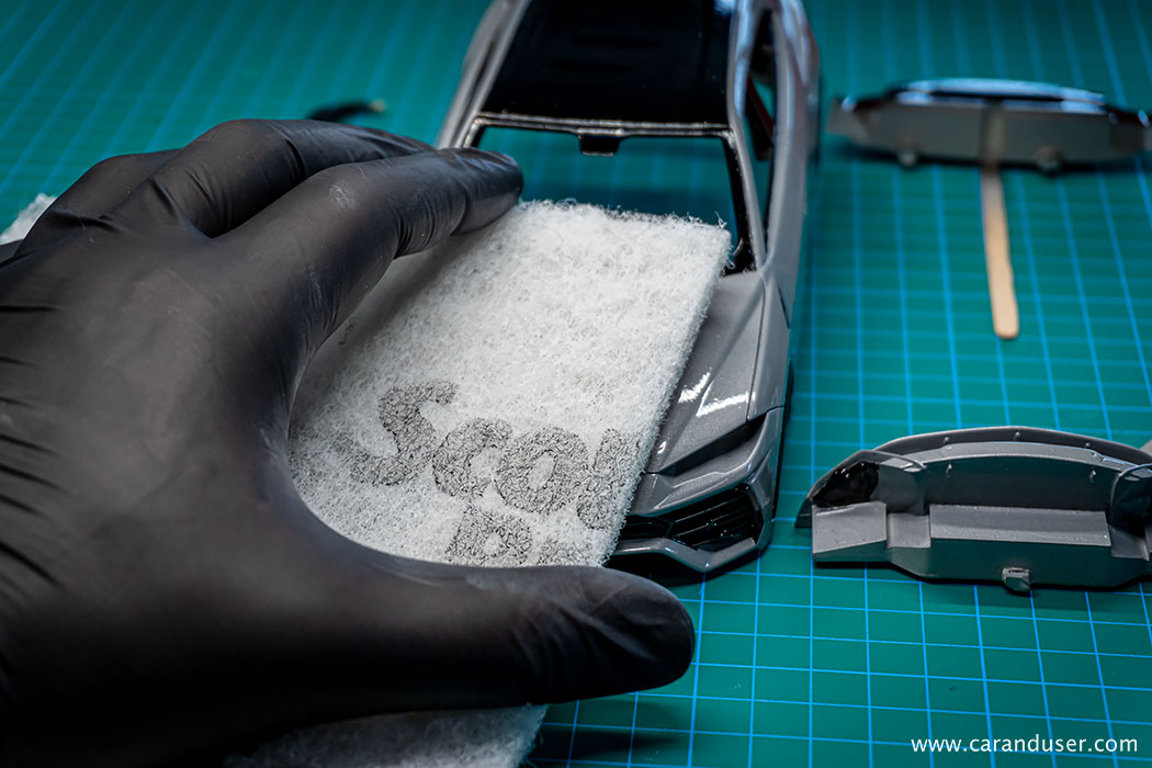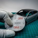 Tokrat nam je pri postopku lakiranje malce ponagajal prah iz okolice, ki se je kar preveč naselil na našo sveže polakirano karoserijo, zato to težavo hitro rešimo z matiranjem (brušenjem) laka z brusnimi gobicami granulacije 2000 in si pri težko dostopnih delih karoserije pomagamo s Scotch Brite mrežico za matiranje površin in ponovimo postopek lakiranja.