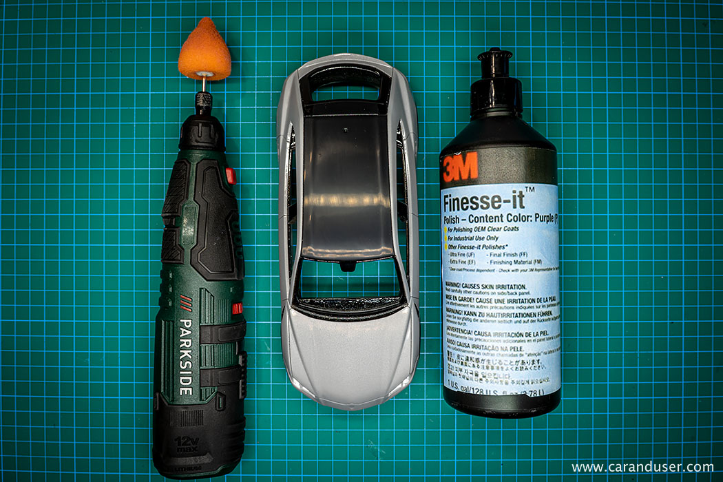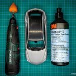 Rezultat ponovnega lakiranja je precej boljši in ostalo nam je še zgolj nekaj manjših prašnih delcev, katere bomo v tem koraku s poliranjem površine tudi odstranili. Kot je že v naši navadi je poliranje tudi tokrat 4-stopenjsko. Prve tri stopnje vključujejo brušenje s polirnimi gobicami Trizact granulacij 3000, 6000 in 8000, zadnji korak k povrnitvi in izboljšanju sijaja pa je strojno poliranje z polirno piramido srednje trdote in 3M polirno tekočino Finesse-it Purple. Tudi omenjene pripomočke za poliranje so nam priskrbeli pri podjetju Spekter Žalec.