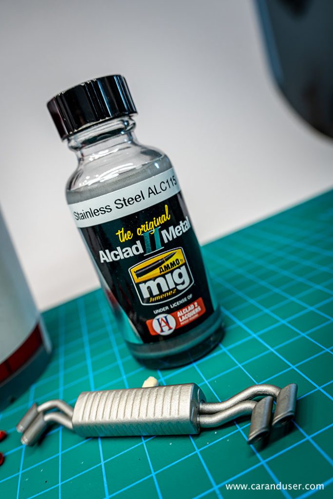 Dno avtomobila odenemo v mat črno bravo, izpušni lonec pa v barvo nerjavečega jekla. Obe omenjeni barvi so nam priskrbeli pri Miniatures.si.