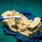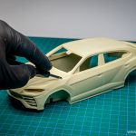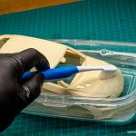 Velja omeniti še obvezen del zaščitne opreme, ki jo potrebujemo od tega koraka dalje. Gre za zaščitno masko, prosto leteči delci resinske smole niso nič kaj prijazni do vaših pljuč in zato so nam pri podjetju Spekter Žalec priskrbeli odlično 3M zaščitno masko z oljčnimi filtri in filtri za zadrževanje prašnih delcev. Z dobro zaščitenimi dihali in ustreznim nožkom (uporabljene sta bili debelini 0,1 in 0,2 mm) se sprehodimo po vseh kanalih, ki jih na Urusu ne manjka. Odvečen material odstranimo z uporabo zobne ščetke in v našem arzenalu pripomočkov poiščemo naslednjega.