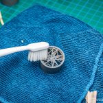 Z namenom zagotavljanja dobre, in predvsem oprijemljive podlage za nanašanje posebne barve, vse resinske dele našega Urusa namočimo v vodo, ki smo ji dodali nekaj kapljic čistila za posodo. Prav to čistilo ima odlično lastnost topljenja maščob in silikonov, ki bi lahko ostali na površini delov za narave ulivanja in odstranjevanja odlitkov iz orodij. Da zagotovimo, da se silikoni ne skrijejo v kanale med paneli, jih skrbno zdrgnemo s ščetko za zobe, vse tako očiščene dele pa postavimo na krpo iz mikro vlaken ter jih pustimo, da se odvečna tekočina vpije v krpo.