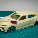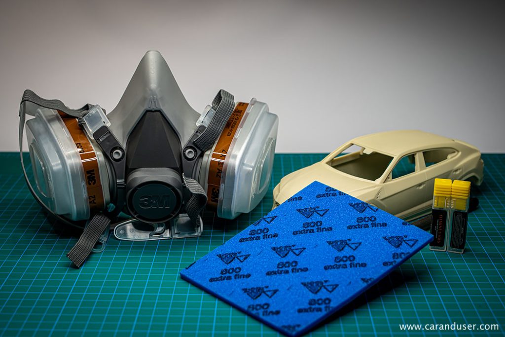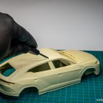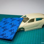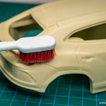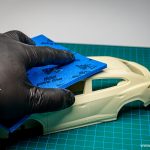 Tokrat gre za brusilno gobico. Uporabimo dokaj grobo gobico granulacije 800 in z njo pobrusimo celotno površino makete. Pri tem postopku posebno pozornost namenimo pregibom na karoseriji in skrbno pobrusimo vse, tudi skrite površine.