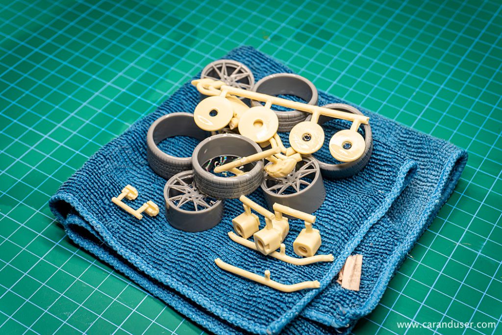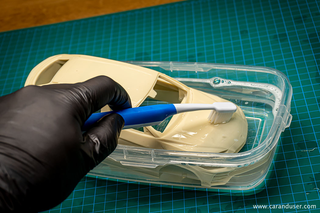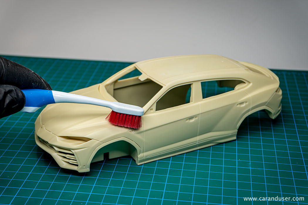 Z namenom zagotavljanja dobre, in predvsem oprijemljive podlage za nanašanje posebne barve, vse resinske dele našega Urusa namočimo v vodo, ki smo ji dodali nekaj kapljic čistila za posodo. Prav to čistilo ima odlično lastnost topljenja maščob in silikonov, ki bi lahko ostali na površini delov za narave ulivanja in odstranjevanja odlitkov iz orodij. Da zagotovimo, da se silikoni ne skrijejo v kanale med paneli, jih skrbno zdrgnemo s ščetko za zobe, vse tako očiščene dele pa postavimo na krpo iz mikro vlaken ter jih pustimo, da se odvečna tekočina vpije v krpo.